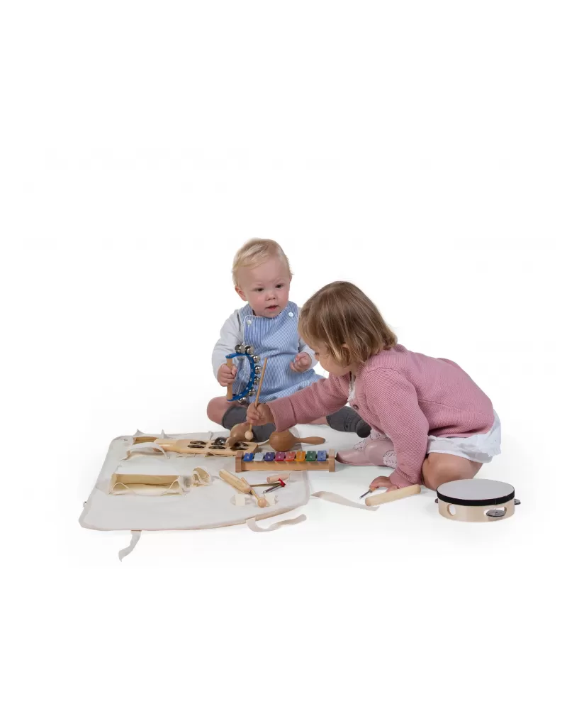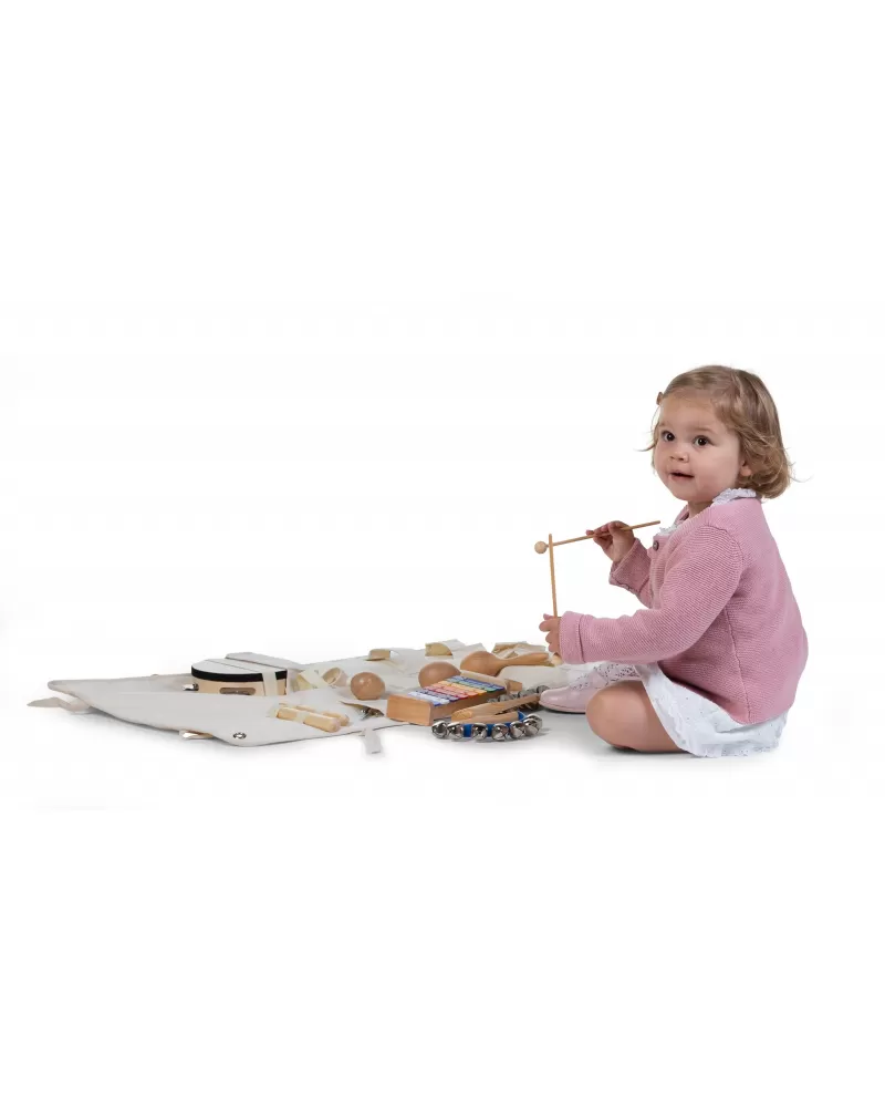 Sada dětských hudebních nástrojů v praktickém textilním organizéru umožní nejmenším hudebníkům seznámit se s hudební improvizací a zajistí jim nekonečnou zábavu.