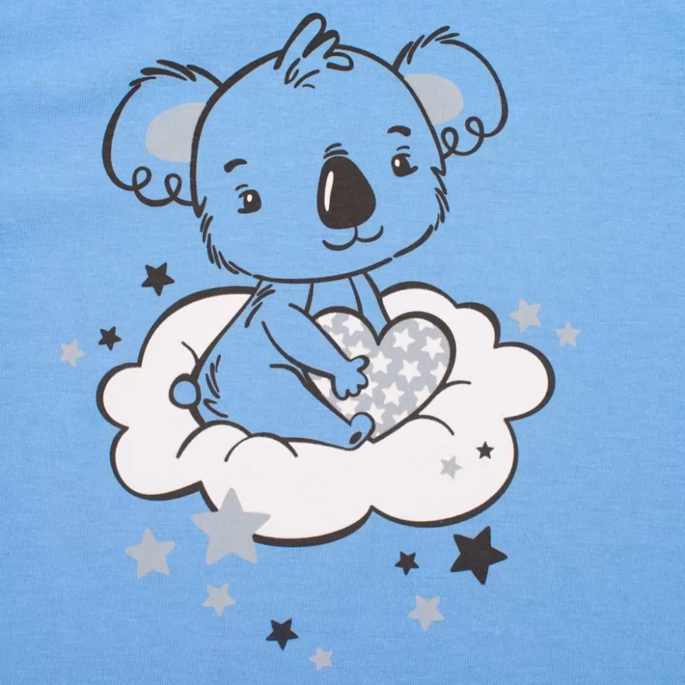 Klučičí bavlněné pyžamko české značky New Baby Dream s medvídkem. Letní pyžamko se skládá z trička s krátkým rukávem a kraťasů. Tričko zdobí na přední straně roztomilý obrázek medvídka na obláčku a hvězdiček. Zapínání na cvočky na ramínku. Kraťasy...