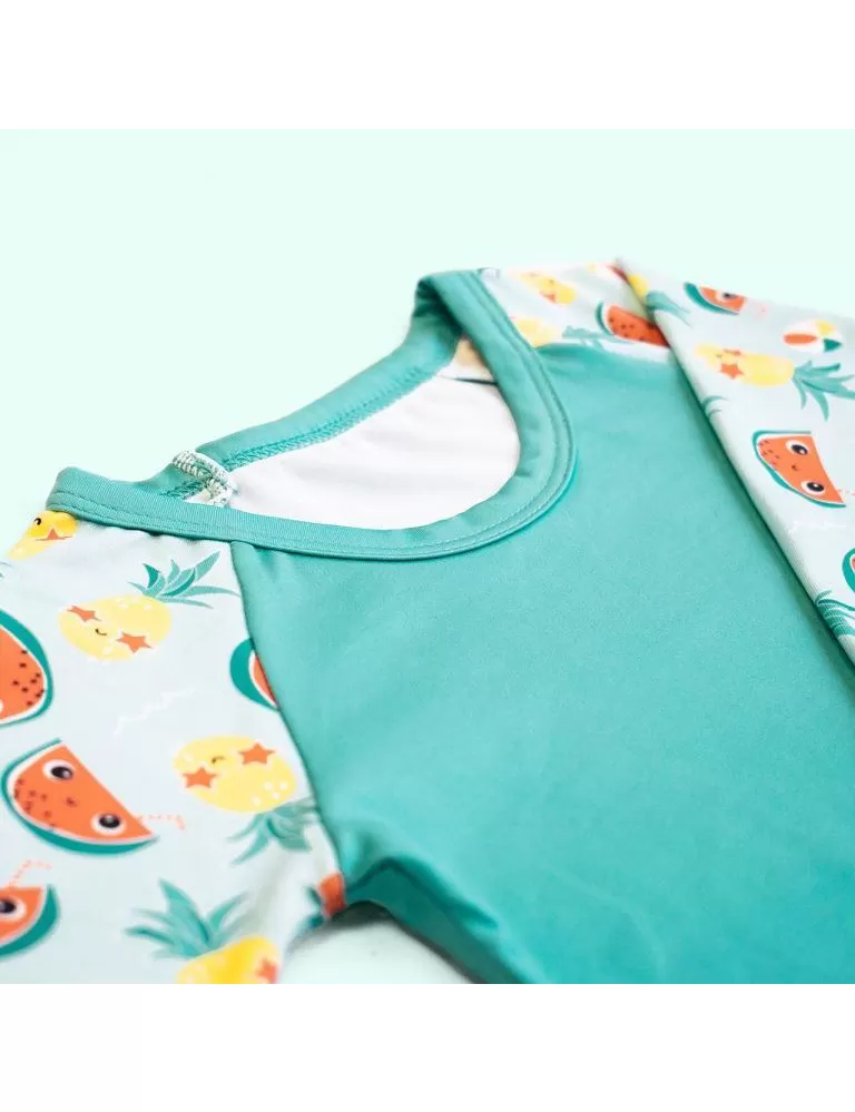 Perfektní UV40+ ochrana pro malé námořníky a objevitele! Chraňte pokožku dítěte s našim dětským tričkem do vody s UV filtrem. Tričko Tropical vhodně doplňuje plavky Bambino Mio, které najdete v souvisejícím zboží.