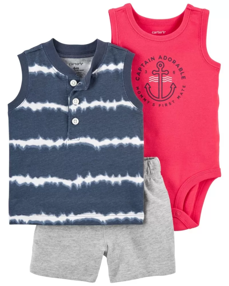 Všechny modely značky Carter 's jsou vyrobeny ze super měkké bavlny a množstvím lásky. 3.dielne sety jsou velmi praktické. Vlastnosti: - 3 ks v setu - pás pro pohodlné nošení - vhodné na teplé letní dny - příjemně měkký materiál - komfortní na nošení - trendy moderní designy a barvy - kalhoty krátké - tričko bez rukávu - body tílko s potiskem kotvy - kalhoty jednobarevné - triko bez rukávů má přední zapínání, patent u krku a na rukávech Materiálové složení: 100% bavlna. Údržba: Doporučujeme dodržovat prací symboly uvedené na etiketě výrobku. Na praní doporučujeme použít prací prostředky značky Chicco. Najdete na našem eshopu.