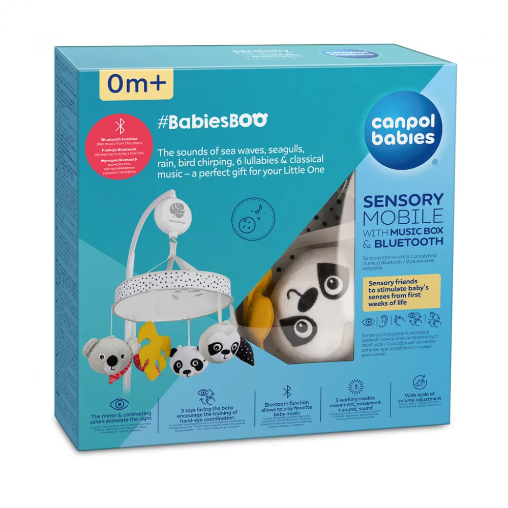 Unikátní a moderní Senzorický plyšový kolotoč s melodiemi/bluetooth BabiesBoo do dětské postýlky zaujme miminko během dne a vytvoří útulnou a klidnou atmosféru pro spánek. Kolotoč hraje 60 minut nepřerušované melodie a po uplynutí této doby se automaticky vypne – 11 melodií: bílý šum, zvuky mořských vln a létajících racků, déšť, lesní hluk a zpěv ptáků, 6 ukolébavek a klasická Mozartova hudba. Zařízení s funkcí Bluetooth vám umožní zapnout oblíbené melodie a pohádky z aplikace na vašem mobilním telefonu. Kolotoč má 3 provozní režimy: pohyb, pohyb a hudba nebo pouze hudba a široký rozsah nastavení hlasitosti – snadno jej přizpůsobíte preferencím vašeho miminka. Canpol baby sensory mobile má speciálně profilovanou čelenku, díky které jej lze snadno a stabilně připevnit na rám dětské postýlky. Na kolotoči je 6 různých hraček, z nichž 3 roztomilá zvířátka koukají na miminko miminka. Kontrastní barvy – bílá a černá v kombinaci se žlutou a červenou barvou upoutají pozornost dítěte a podněcují fantazii. Na celé ploše spodního průměru je zrcadlo, ve kterém dítě vidí svou tvář, vzbuzuje jeho zvědavost a zájem. Přívěsky připevněné na mobilu a velké zrcátko vybízejí dítě k natahování rukou směrem k nim, což podporuje rozvoj jeho svalů a zapojuje zrak a trénuje koordinaci oko-ruka. Senzorický mobil Canpol Baby s hudebním boxem a Bluetooth BabiesBoo je perfektní tip na dárek pro novorozence nebo pro miminko. Vlastnosti: - 11 melodií – zvuky mořských vln a racků, déšť, zvuk lesa a zpěv ptáčků, 6 ukolébavek a klasické příjemné písničky. - Funkce Bluetooth vám umožní zapnout oblíbené melodie a pohádky vašeho miminka z aplikace v telefonu. - 60 minut nepřerušovaných melodii a automatické vypnutí. - Široký rozsah ovládání hlasitosti – můžete jej snadno upravit podle preferencí vašeho dítěte. - 3 pracovní režimy – otáčení, melodie a rotace nebo jen melodie. - 3 závěsné hračky otočené směrem k dítěti jej povzbuzují, aby používalo aktivně ručičky. - Velké zrcadlo po celém průměru a kontrastní barvy přitahují pozornost dítěte a podněcují fantazii. - Kontrastní barvy podporují správný vývoj zraku dítěte. - Snadný a intuitivní ovládací panel. - Pevné a pohodlné uchycení na dětskou postýlku. - Ideální pro děti od prvních okamžiků života. Hračka je vyrobena z bezpečného materiálu bez bisfenolu A. Karusel by měl být instalován v souladu s pokyny, které jsou součástí balení. Hračka je napájena AA bateriemi (balení neobsahuje baterie). Součástí je datový USB kabel.