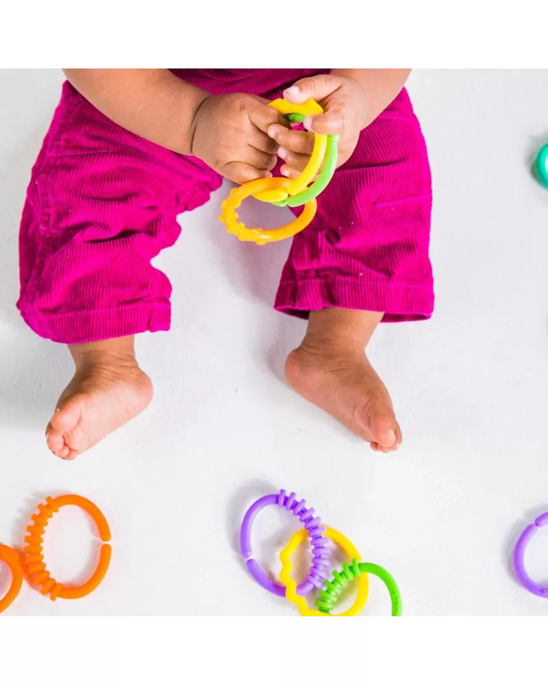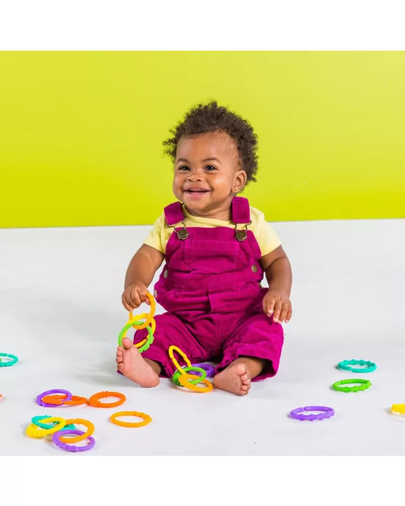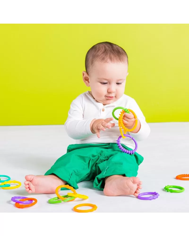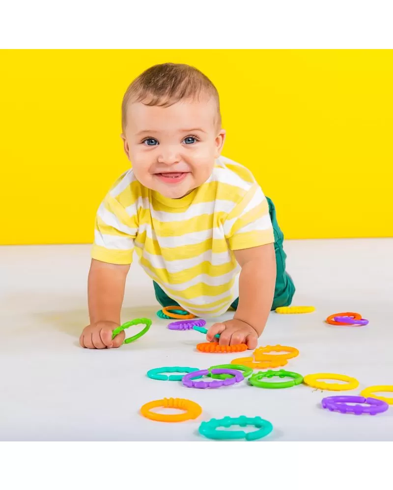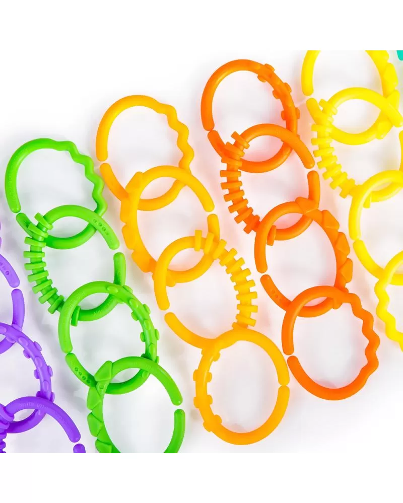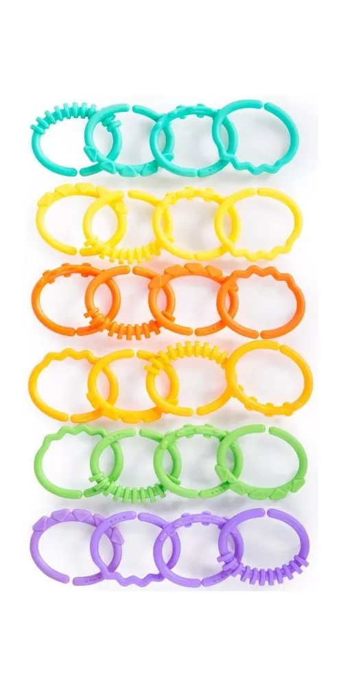 Ideální pro připojování hraček téměř kamkoli! Veselý řetěz, který lze spojovat a zase rozopjovat je u dětí velmi oblíbený. Rozvíjí jemnou dětskou motoriku. Lze využít i k jiným účelům např. k zavěšení na kočárek, na hrazdičku, jendotlivé články řetězu lze využít i samostatně k zavěšení dalších hraček. 18 zábavných oček s texturou povrchu pro rozvoj hmatu. Modelování na 6 očkách vytváří měkký povrch, vhodný ke kousání.