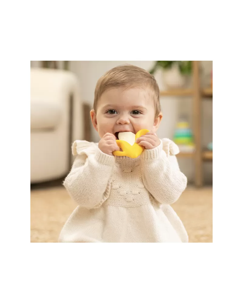 Rozkošné kousátko v podobě usměvavého banánu je vyrobeno z pružného měkkého silikonu. Různorodé textury lákají dítě ke zkoumání v ústech, masírováním dásní kousátko pomáhá dítěti při prořezávání prvních zoubků.