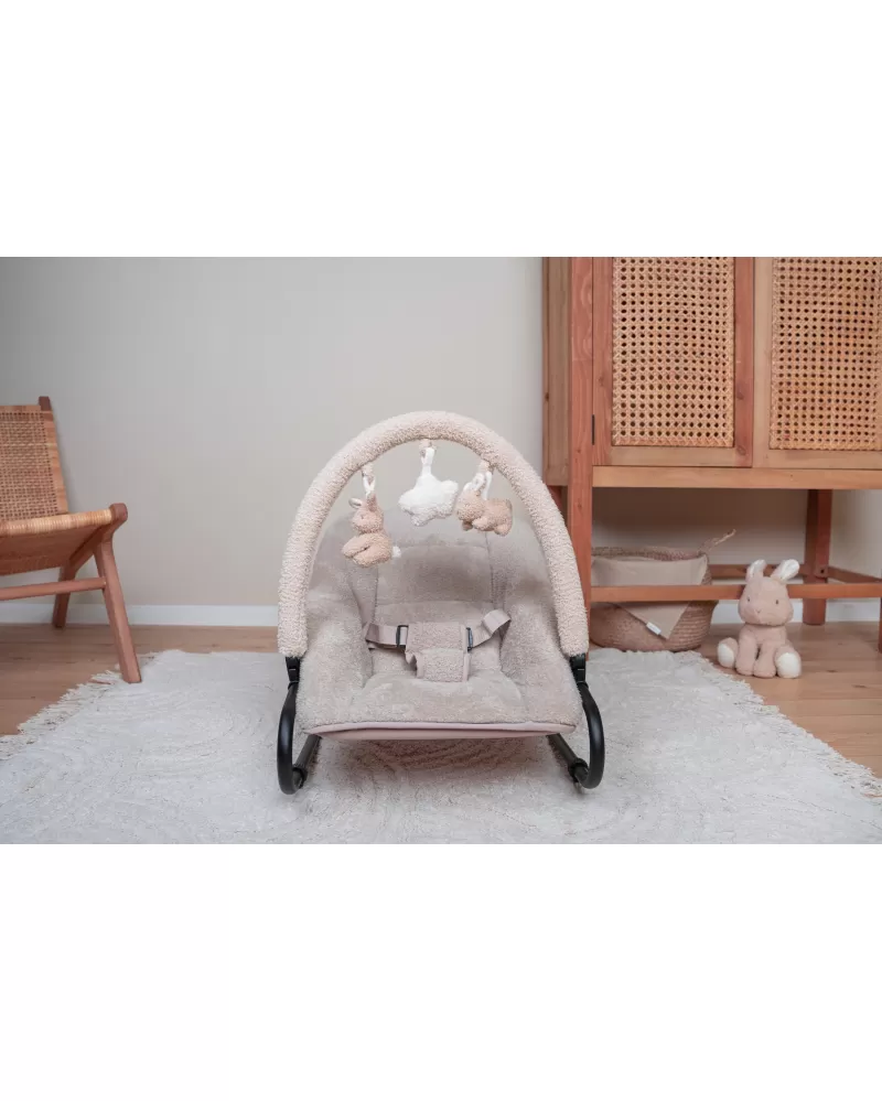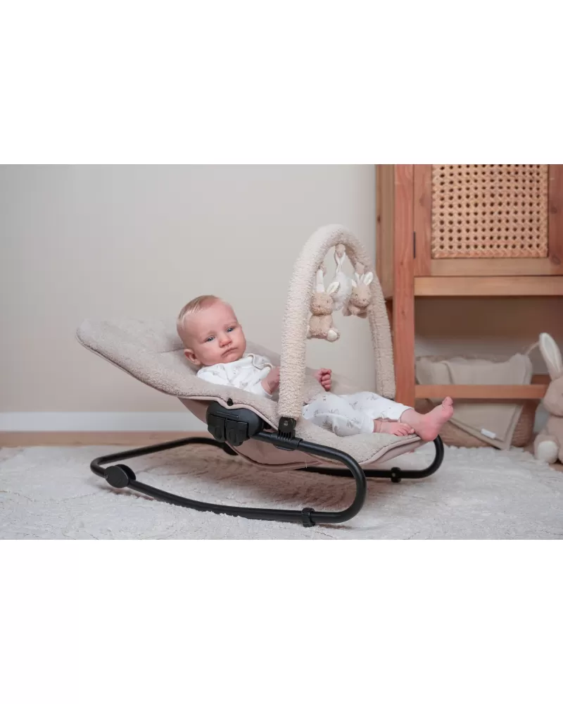 Houpací lehátko Little Dutch s hrazdou poskytne vašemu dítě pohodlné místo k odpočinku i hraní. Pozornost dítěte upoutají tři zavěšené plyšové hračky v podobě slepičky, kytičky a ovečky.