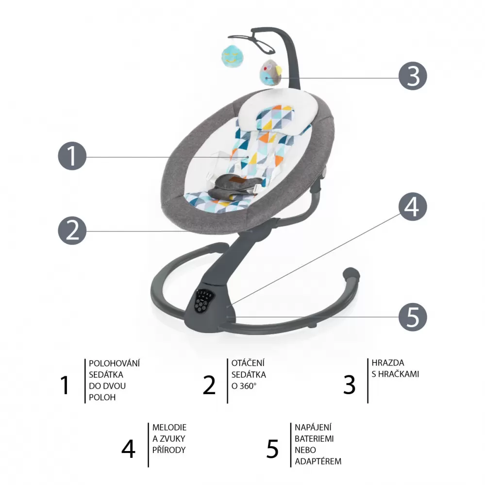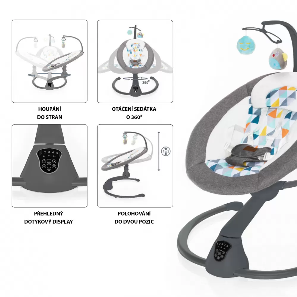 Otáčení o 360°, 5 stupňů intenzity houpání, automatické zapnutí, nastavení doby houpání, dotykový ovládací panel, dálkový ovladač, hrazda s hračkami, 5 bodový bezpečnostní pás, zvuky pro uklidnění – to je multifunkční lehačka Lullaby. Vhodná pro děti od narození do 9 kg.