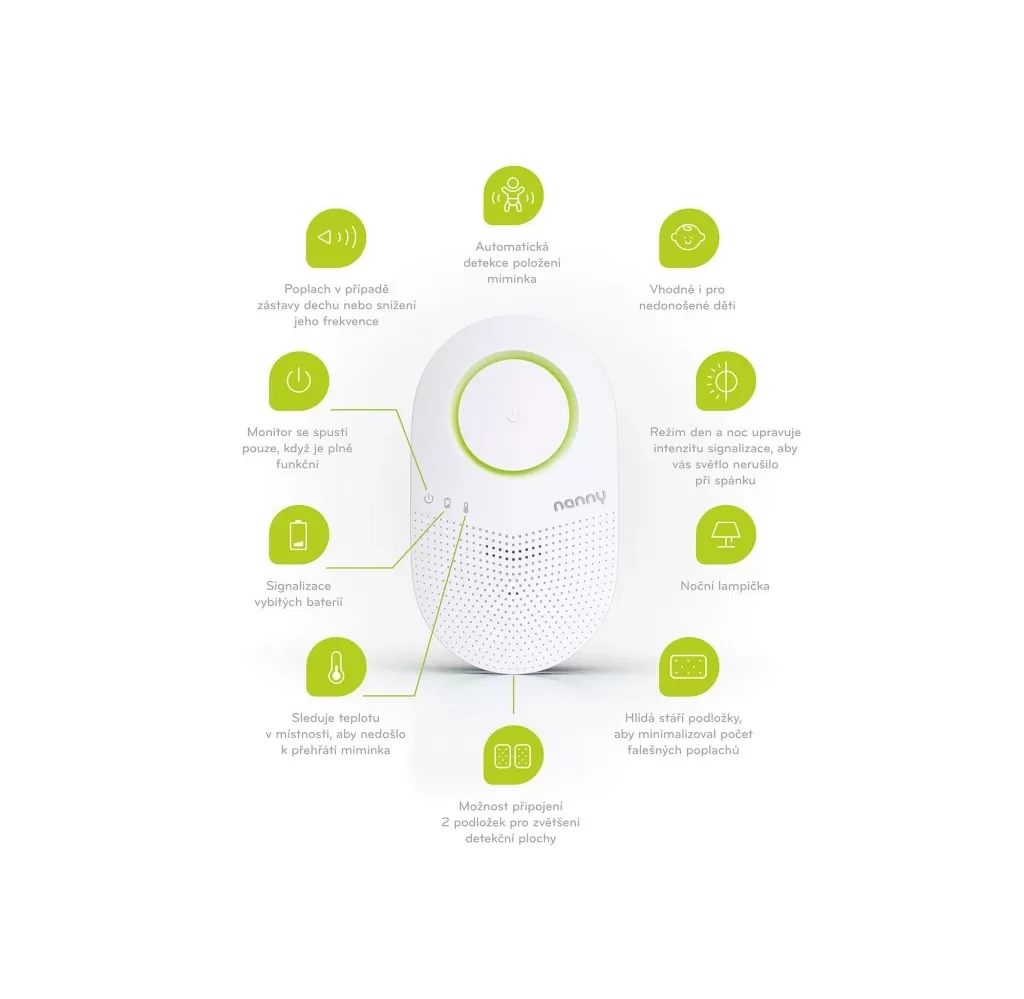 Nanny BM-03 je certifikovaný zdravotnický prostředek, který monitoruje dýchání dítěte a je vhodný i pro nedonošená miminka od 1kg hmotnosti. Jako jediný monitor na trhu také hlídá stáří podložky. V případě, že již překročila dobu své životnosti, upozorní vás na to během automatického testu funkčnosti při zapnutí.