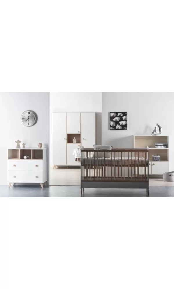 Komoda poskytne dostatek místa na vše potřebné pro Vaše miminko, v horní části otevřená polička pro velmi frekventované potřeby nebo pro věcí, po kterých potřebujete sáhnout ospalá poslepa, níže dva šuplíky chránící věci před prachem. Komoda je optimálně vysoká pro pohodlné přebalování. Součástí dodávky je přebalovací nástavec, který později můžete odmontovat a komodu dále používat bez něj.