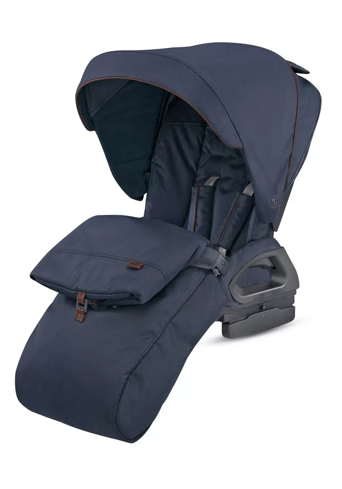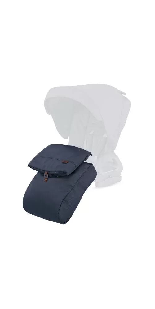 Náhradní nánožník na sportovní sezení kočárku Inglesina Quad v barvě Oxford Blue se zdobením v ecokůži v barvě coffe.  Pasuje na všechny sportovní sedačky Sofia/Quad/Vittoria/Trilogy.
