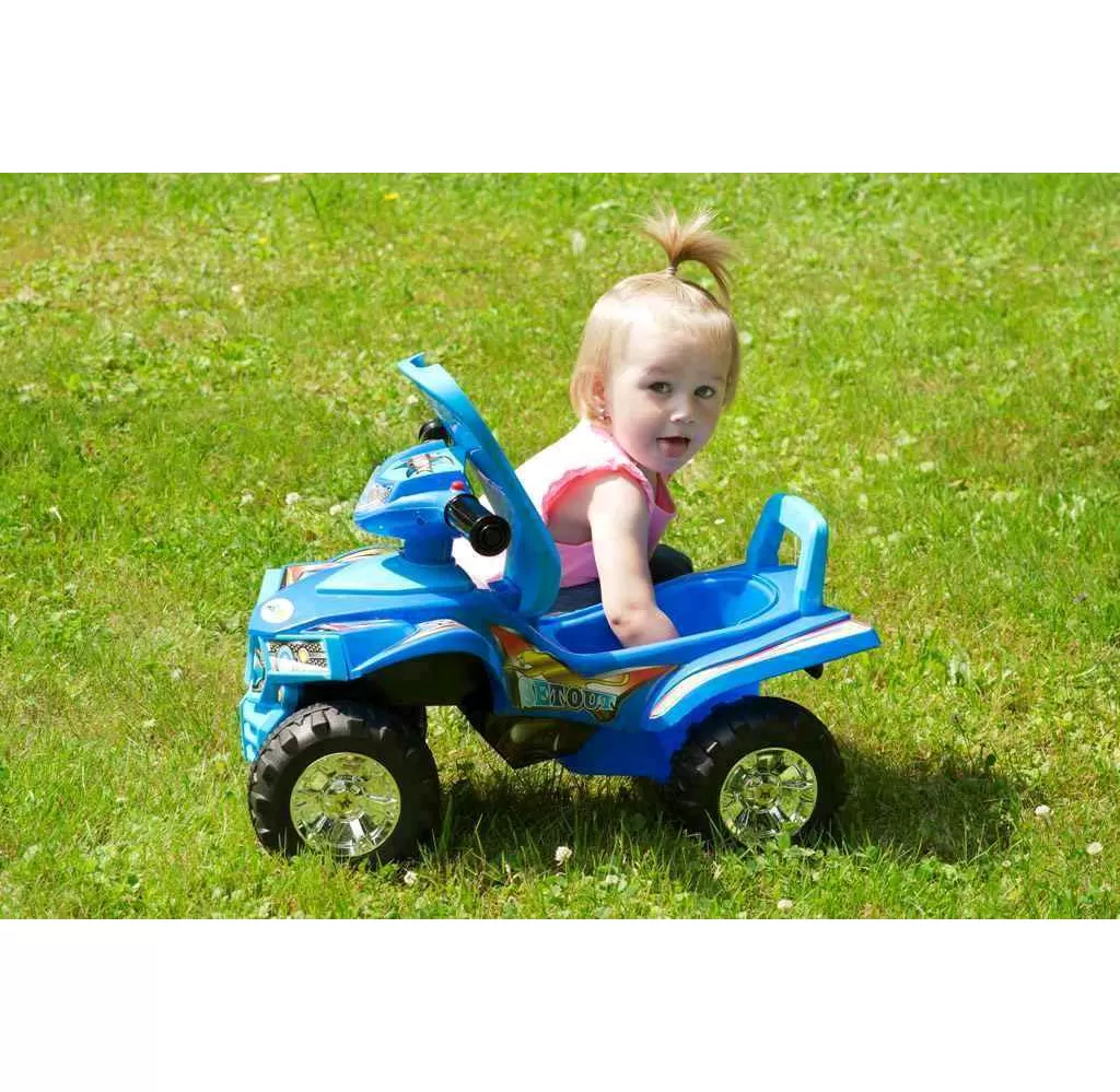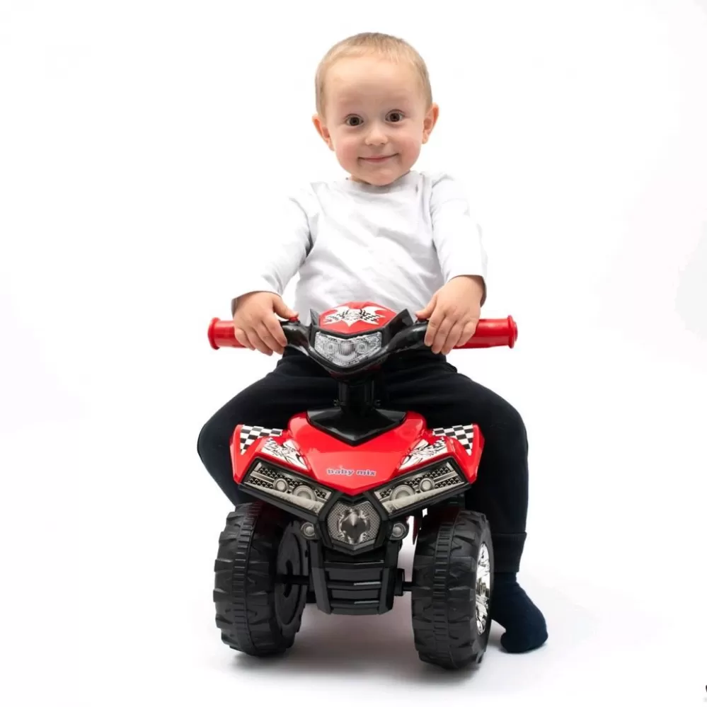Skvělá Čtyřkolka Baby Mix se třemi melodiemi, klaksonem a blikajícími světýlky na řídítkách. Čtyřkolka má veselé barvy a je vyrobena z kvalitního a pevného plastového materiálu. Odrážedlo pomáhá rozvíjet motorické schopnosti dítěte a zaručí mu spoustu zábavy a legrace. Je určeno jak pro nejmenší děti, které už umí sedět, tak i pro děti, které se už naučily chodit. S čtyřkolkou si Vaše dítě užije spoustu legrace a zábavy. Naše super čtyřkolka skvěle vypadá, má komfortní široké sedadlo, široká řídítka a velká plastová kola. Na řídítkách má efektní houkačku a tlačítko se třemi uloženými melodiemi. Baterie nejsou součástí balení (2x AA 1.5V). Barvy samolepek se mohou lišit dle aktuální nabídky.