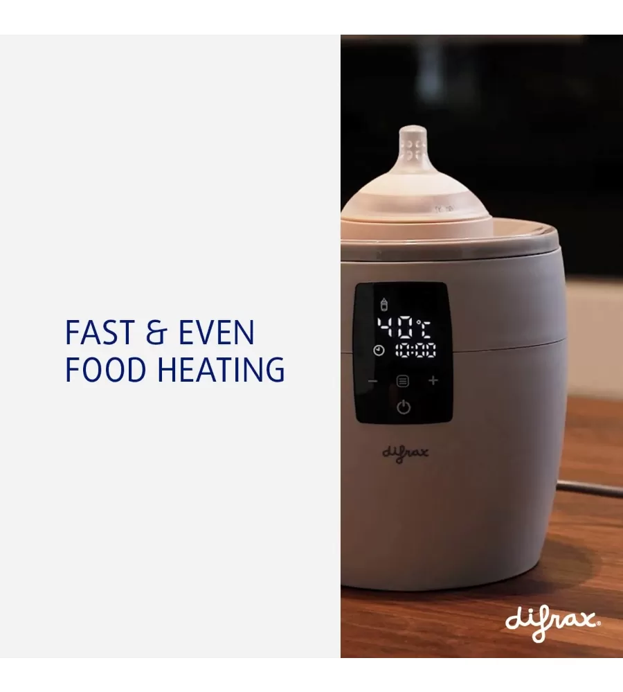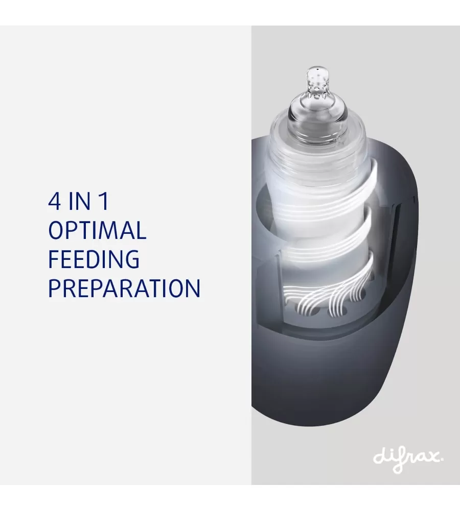 Elektronický ohřívač lahví Difrax je vhodný k rychlému a bezpečnému ohřevu mléka, nápojů i stravy (v lahvích). Ohřívač lahví má také nastavení rozmrazování a nastavení pro dlouhodobé udržení teploty lahví a sklenic. Ohřívač lahví je vhodný také pro (parní) čištění lahví a drobného příslušenství.