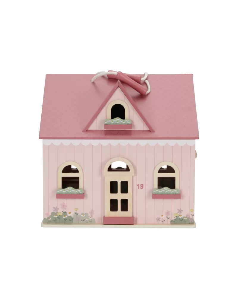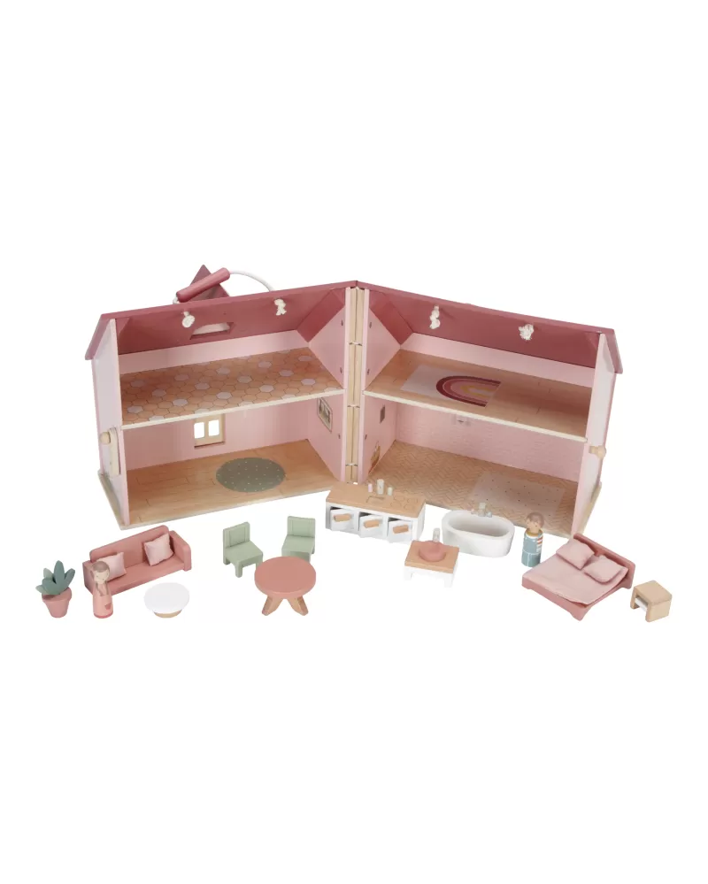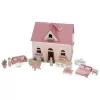 Roztomilý dřevěný domeček pro panenky Little Dutch má v přízemí obývací pokoj s kuchyní a v patře ložnici s koupelnou. Každý pokoj je zařízen odpovídajícím nábytkem a doplňky, součástí jsou i dvě dřevěné panenky Jim a Rosa. K domečku je možné dokoupit další sady nábytku, domází mazlíčky apod.