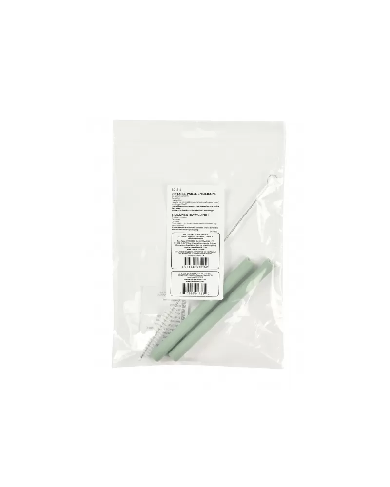 Dvě náhradní brčka k silikonovém hrnku s brčkem Beaba. Součástí balení je i dlouhý úzký kartáček pro čištění silikonového brčka.