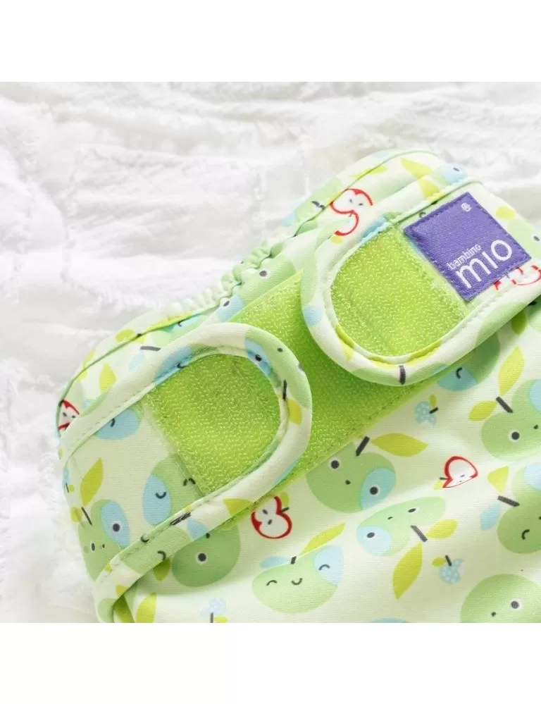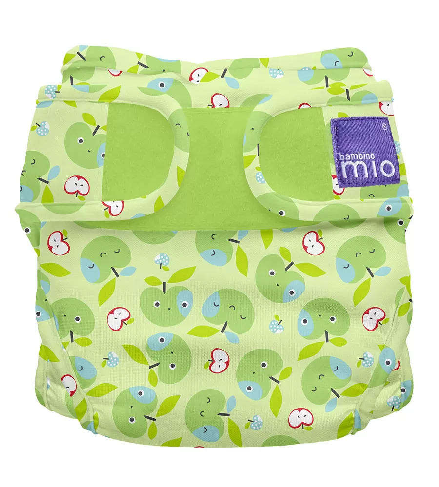 Svrchní plenkové kalhotky Miosoft Apple Crunch patří k dvoudílnému systému Bambino Mio, kde jedna velikost originální plenky a dvě velikosti plenkových kalhotek budou stačit od narození do doby, kdy bude vaše děťátko chodit na nočník. Díky svému zapínání na suchý zip je práce s nimi velice rychlá, jednoduchá a umožňuje přizpůsobení každému dítěti. Tvar suchého zipu brání vytváření ostrých rohů a tak chrání před odřením jemné dětské pokožky. Vnitřní polyuretanová vrstva propouští menší molekuly plynů a par avšak zabraňuje průchodu kapalin a tekutin. Dítě se tak nezapaří, ale ani neznečistí své okolí. Pozor, působení dětských olejíčků snižuje životnost nepropustné vrstvy.