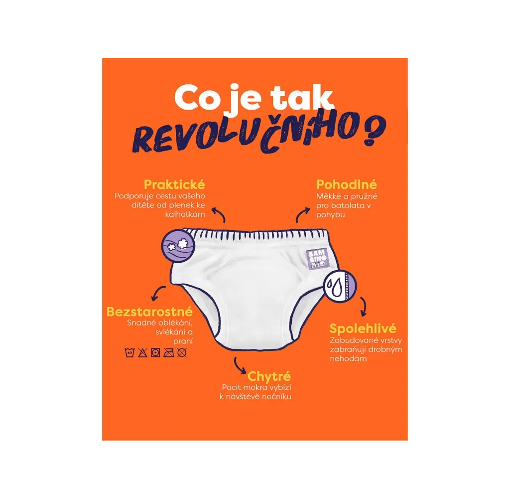 Nepropustná vrstva spolu s absorpční vrstvou částečně chrání před znečištěním okolí. Pomáhají zrychlit proces učení se na nočník avšak nenahrazují plenky. Můžete je dát dítěti jako dárek. Dodají dítěti pocit, že již vyrostlo a plenky nepotřebuje. Nepoužívejte je dříve než je dítě k přechodu na nočník připraveno. Učící plenkové kalhotky sice obsahují absopční vrstvu, která zachytí menší množství moči, ale nenahrazují plnohodnotně vícevrstvou plenku s kalhotkami. Jsou určeny pro dítě, které již přechází na nočník a občas se mu přihodí nepříjemná příhoda. V učících plenkových kalhotkách vlhkost ihned ucítí, může si ji uvědomit a posadit se na nočník. Učící plenkové kalhotky nedávejte dítěti na noc či na spaní a pokud nemáte jinou možnost vložte do nich ještě další vícevrstvou plenku Bambino Mio, která doplní absorpční kapacitu. Před prvním použitím učící plenkové kalhotky minimálně dvakrát předeperte.