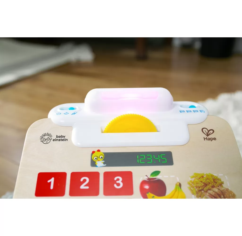 - Obsahuje skener, kreditní kartu a 3 mince, které pomáhají miminku napodobovat pokladnu.