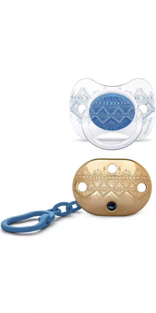 Nechte se unášet luxusem španělské značky Suavinex. Nové překrásné průzračné a nadčasové materiály řady Premium Couture 2018 - láhve, dudlíky a klipy na dudlíky nesou prvky kombinací s nadčasovými materiály a detaily inspirovanými posledními trendy ve šperkařství. Průsvitnost, pozlacený povrch a nádherné zlaté aplikace řady Premium Couture 2018 Vás uchvátí! Zlaté odstíny vytvářejí originální osobité vzory kombinovatelné spolu s kojeneckými láhvemi řady Premium Couture 2018. Set z kolekce Premium Couture 2018 v podobě klipu a dudlíku ve sladěných barvách bude krásným dárkem. Dudlík je vyroben ze speciálního zdravotního vyztuženého silikonu, velmi měkkého, nepropustného nežádoucím pachům, chuti. Vzduchové průduchy zabezpečují stálou cirkulaci vzduchu kolem dětské pokožky. Dudlík je velkým pomocníkem pro klid Vašeho miminka ať již při spánku, nebo vycházce. Je dokázáno, že sání dudlíku uvolňuje endorfin, takzvaný hormon štěstí, který přináší miminku příjemný pocit, který ho uklidňuje a konejší. Dopřejte miminku dudlík místo prstů či pěstičky, protože tato varianta může velmi porušit dentální vývoj. Veškeré savičky i dudlíky jsou podpořeny a vyráběny ve spolupráci s Asociací španělských dětských ortodontistů a respektují přirozený vývoj dásní, zubů i patra dítěte. Klip řady Premium Couture 2018 doplňuje celou sérii ve svém pozlaceném designu. Krásný a praktický klip umožňuje upevnit dudlík na oblečení dítěte a předchází jeho případnému upadnutí na nečistou zem anebo jeho ztrátě. Upozornění - klipy není potřeba sterilizovat či vyvařovat, pouze omýt teplou vodou s jemným čistícím přípravkem pro miminka. Barvy použity pro dekorování výrobků značky Suavinex jsou přírodní a netoxické, přehnané čištění je může poškodit.
