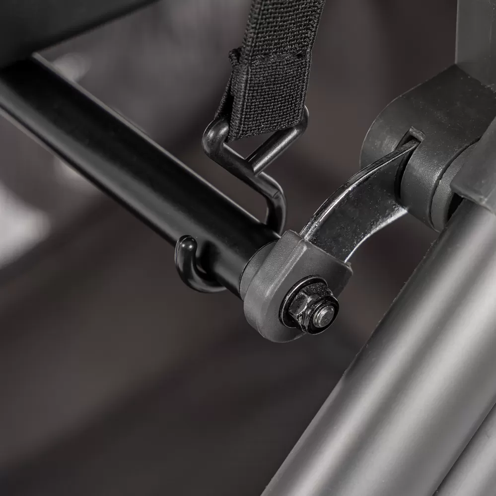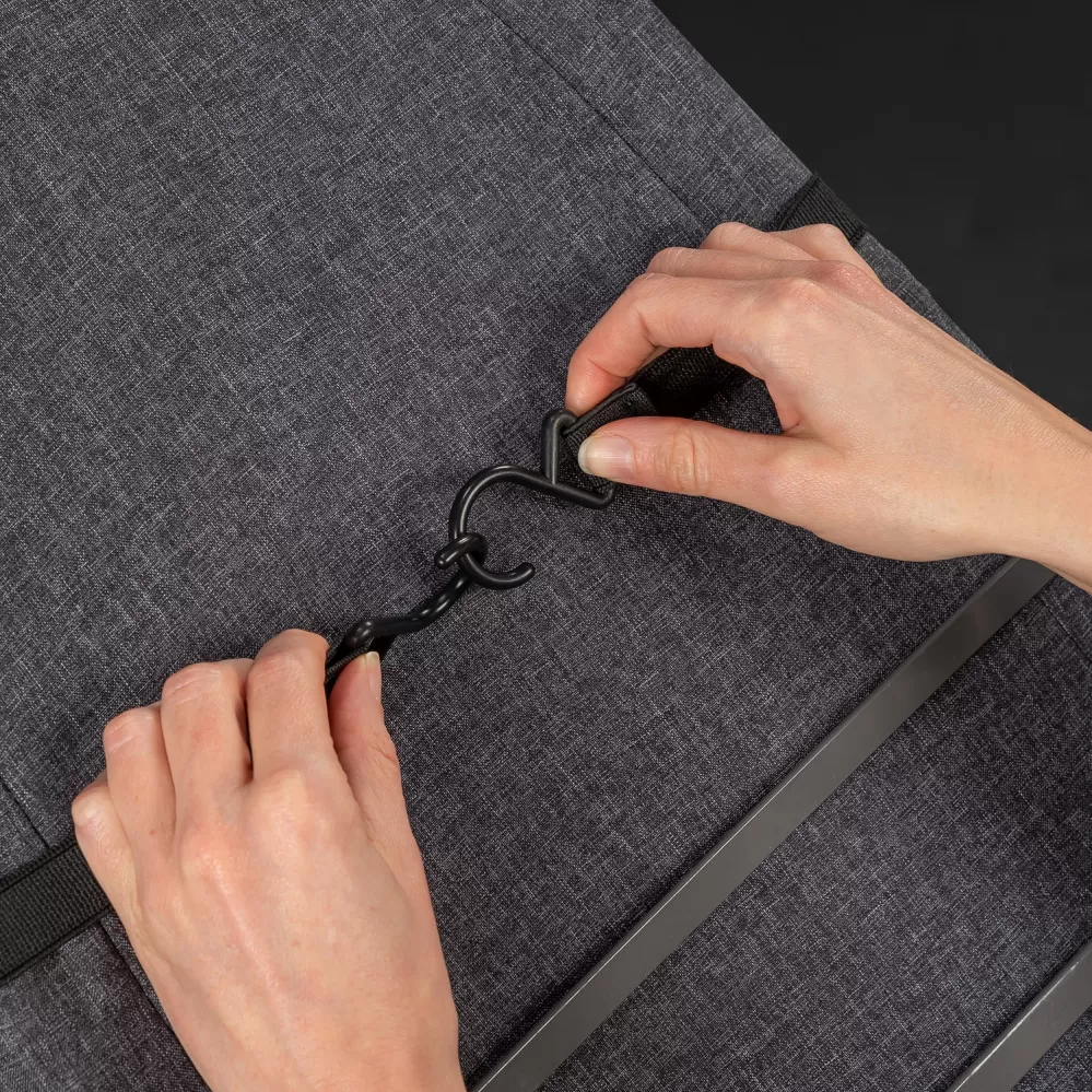 Sluneční clonu lze snadno připevnit pomocí háčků ke korbičce i sportovnímu sezení. Druhý konec clony se poté přetáhne přes rukojeť kočárku nebo opěrku nohou sportovního sezení.