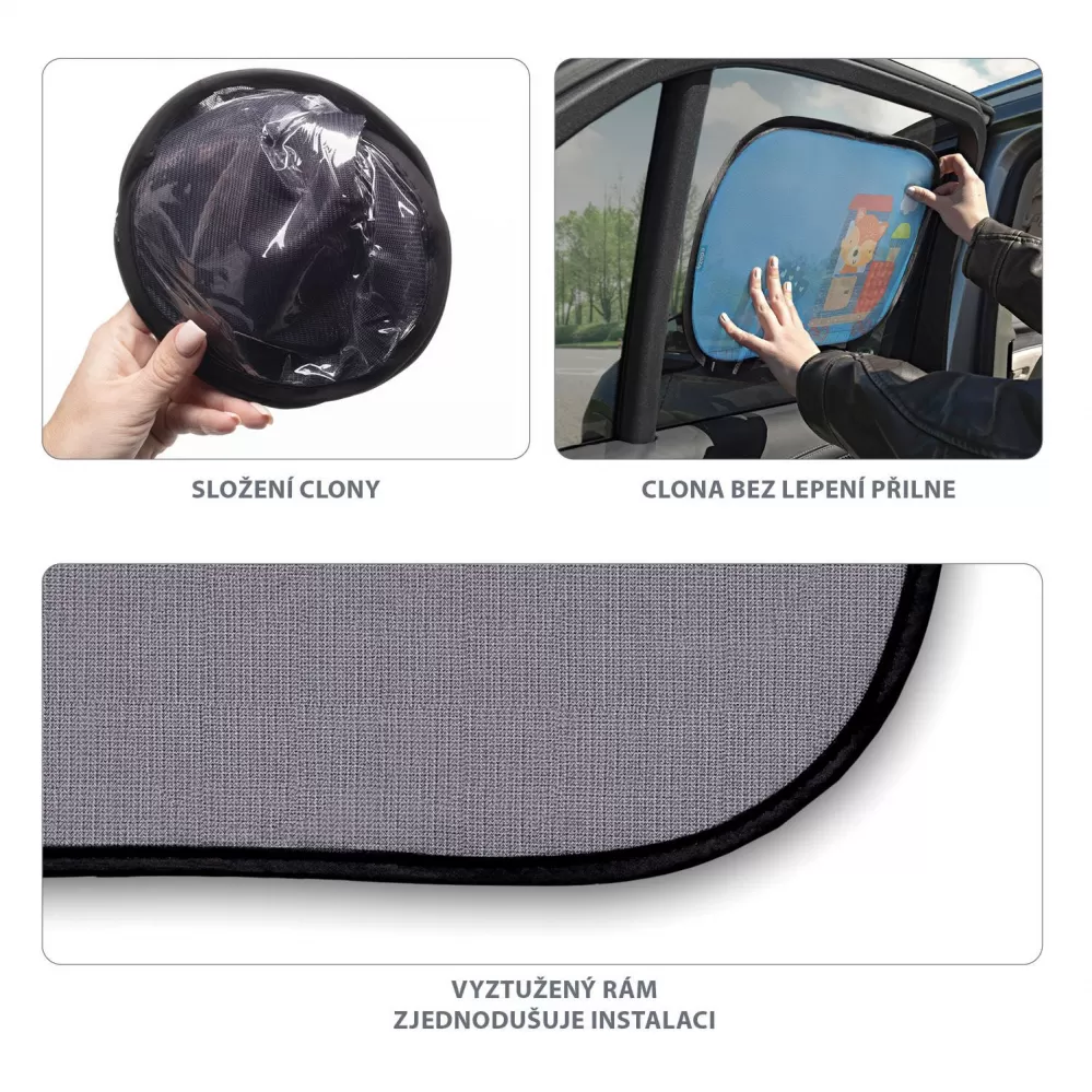 Síťovaná sluneční clona chrání dítě v autě před sluncem. Obsahuje UPF 30+. Její vyztužený rám usnadňuje instalaci a přemísťování. Skládání je snadné a po složení je velmi skladná a šetří místo.