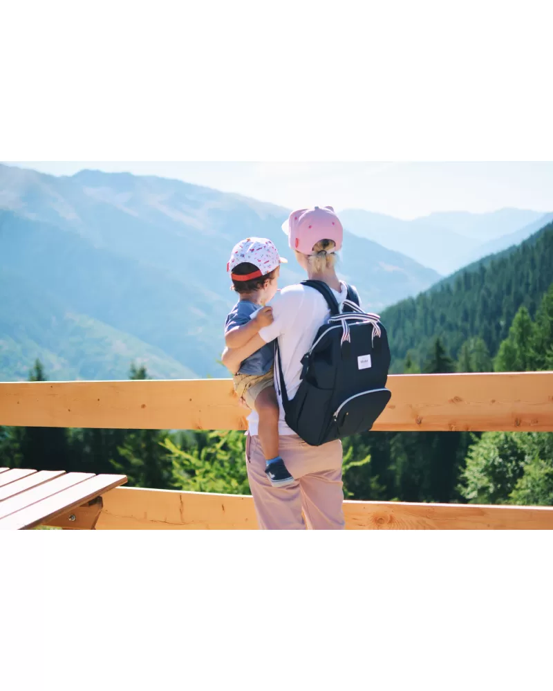 Batoh je vyroben z voděodolné tkaniny, kterou snadno vyčistíte otřením. Přebalovací podložku je možno prát v pračce.