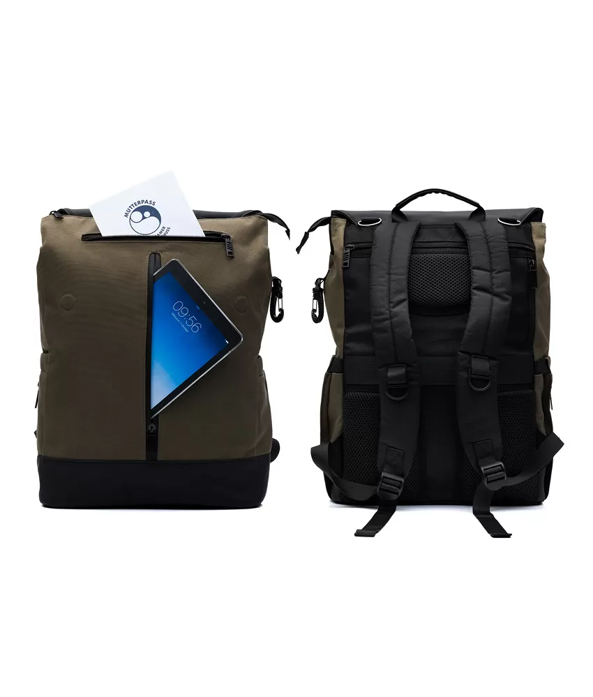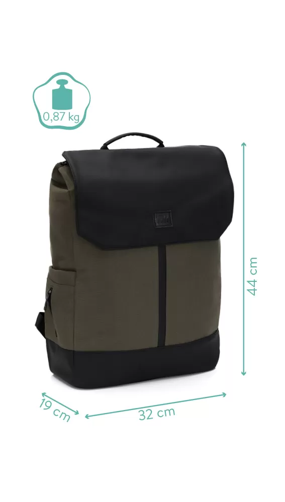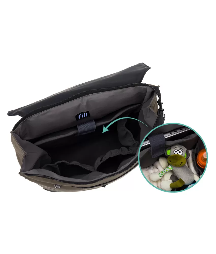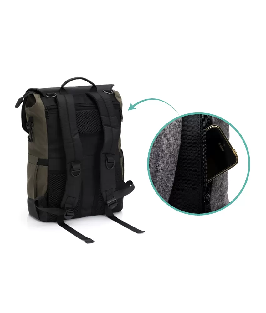Kapsa na přední straně batohu je vhodná na telefon. Přihrádka na zadní straně nabízí bezpečný úložný prostor pro peněženku, klíče nebo jiné důležité předměty a spolehlivě je tak ochrání před zloději. Uvnitř batohu je místo pro potřeby vašeho dítěte jako např. pleny, hračky a láhev a také je zde místo pro váš notebook.