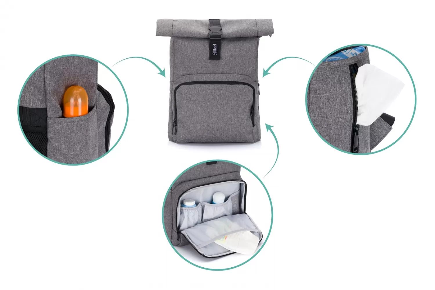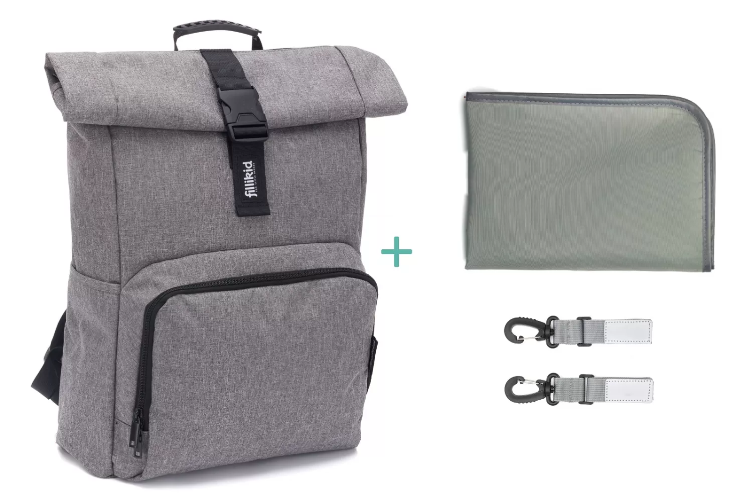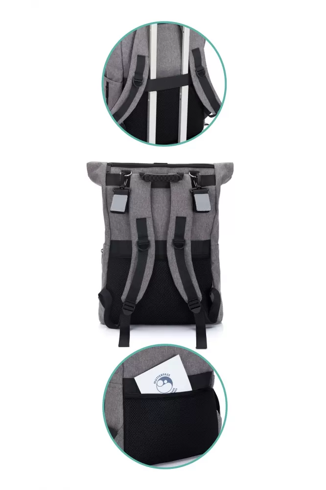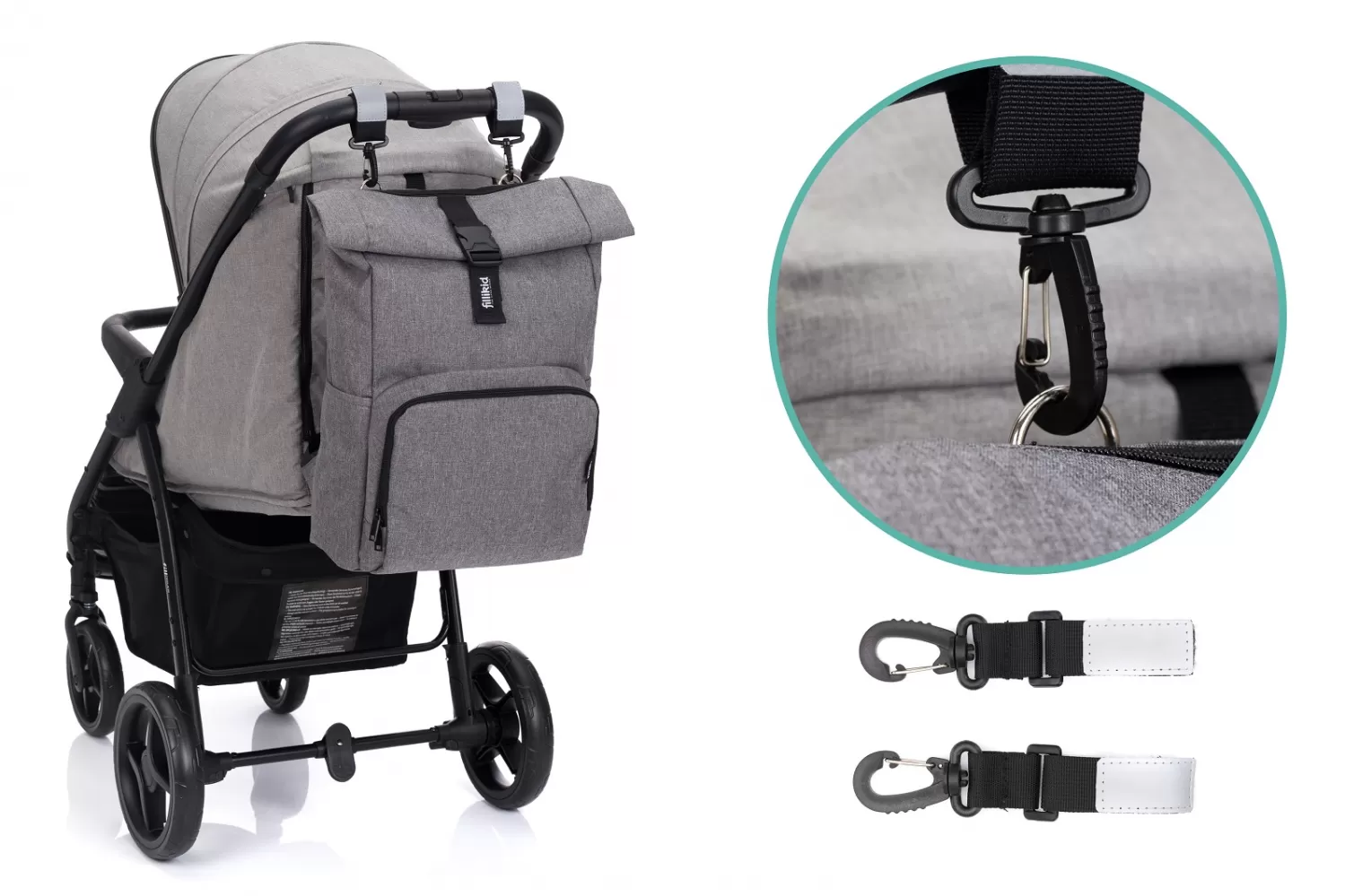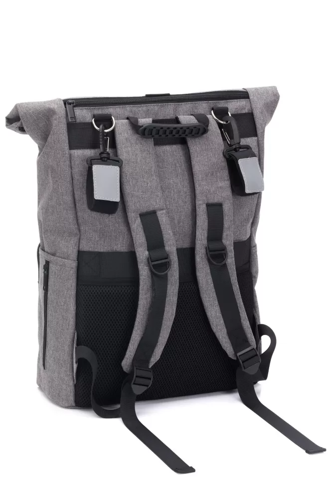 Tento všestranný batoh doplňují dva přiložené upevňovací klipy, takže batoh lze snadno připevnit k rukojeti kočárku nebo autosedačky. Jako další bezpečnostní prvek tyto klipy odrážejí světlo reflektorů automobilu v noci nebo za soumraku.