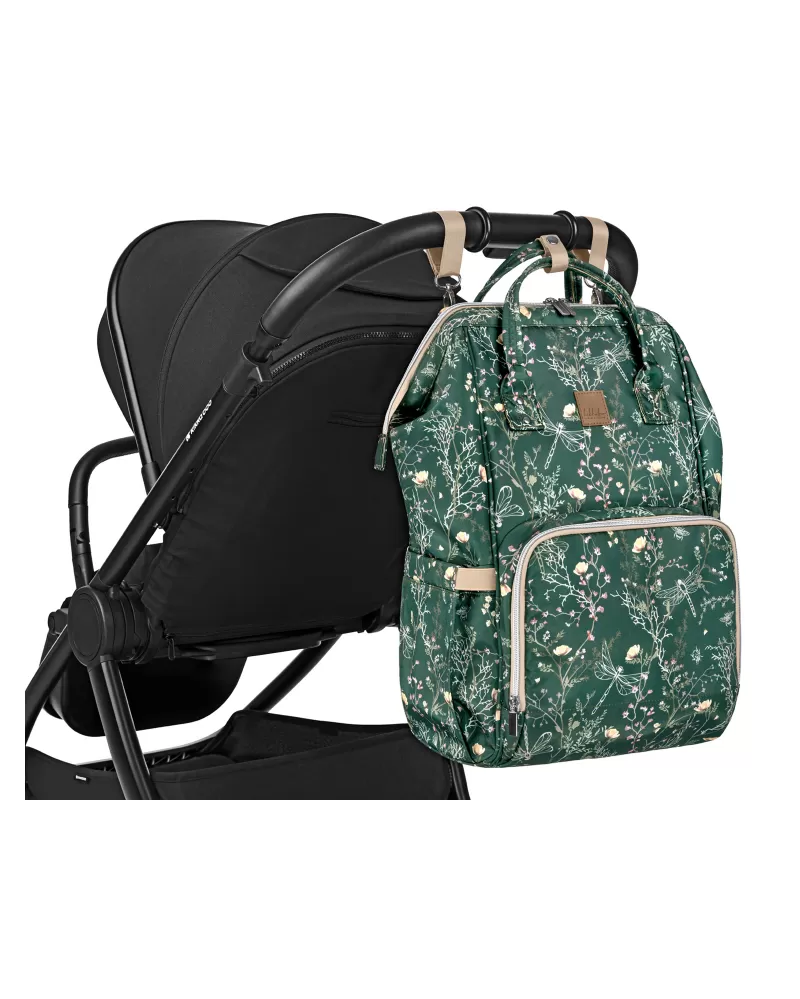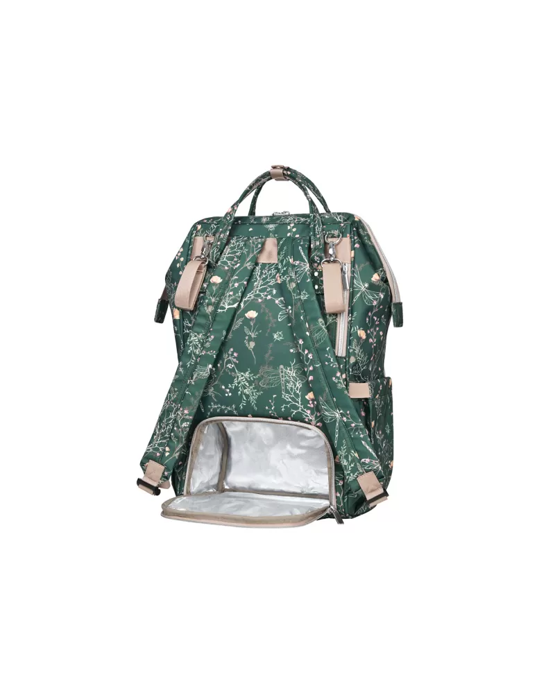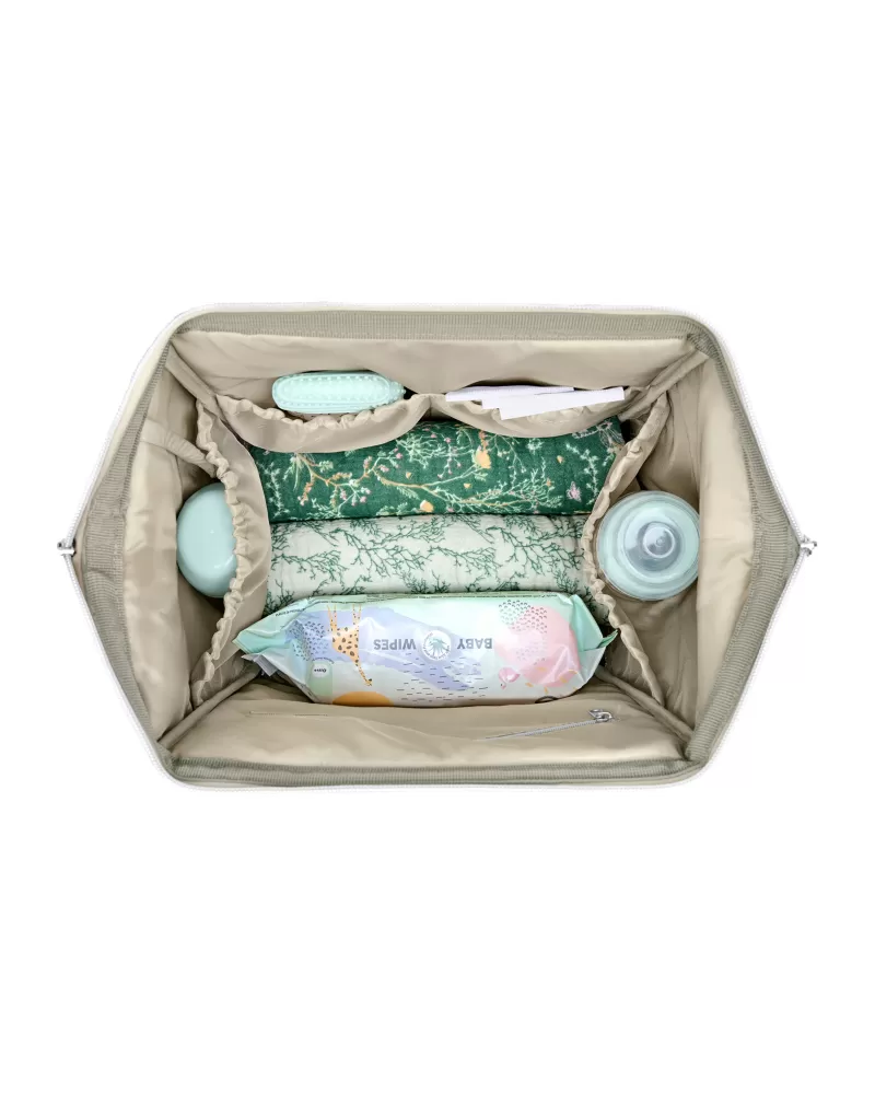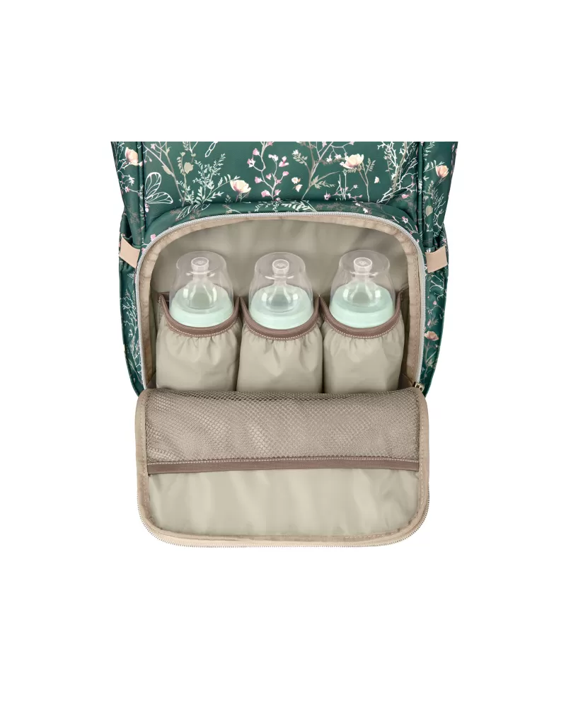 Uvnitř batohu najdete množství kapes a přihrádek i voděodolnou kapsu pro uložení vlhkých předmětů. Široký způsob otevírání batohu usnadňuje orientaci v uloženém obsahu. Na vnější straně najdete kapsy s uzavíráním na zip i kapsu pro uložení láhve. Termoizolační kapsy na láhve pomáhají udržet nápoje či mléko delší dobu v optimální teplotě. Součástí batohu je i přebalovací podložka.