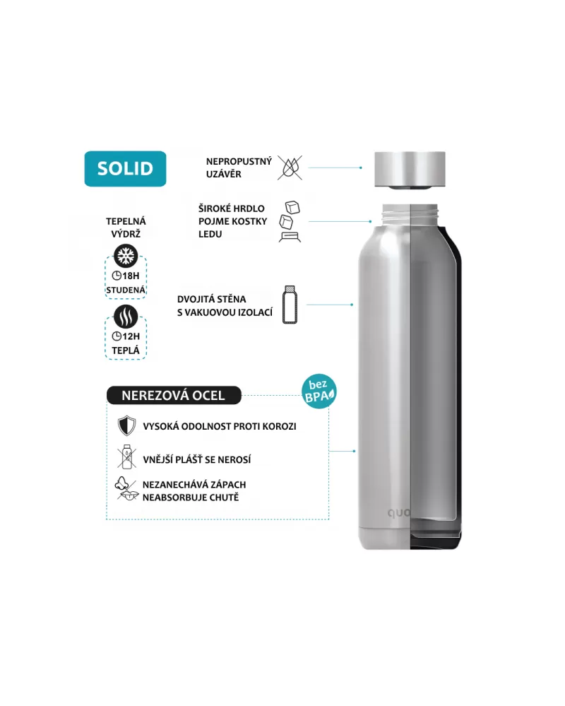 Termoska Quokka Solid z vysoce kvalitní dvoustěnné oceli se spolehlivým, 100% těsnicím uzávěrem udrží váš nápoj dle potřeby teplý či studený. Široké hrdlo umožňuje vložení kostek ledu. Termoska udrží teplotu studeného nápoje s ledem až 48 hodin, studeného nápoje až 18 hodin a teplého nápoje až 12 hodin.