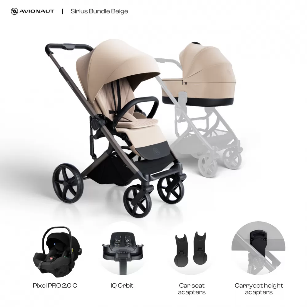 obsahuje: dvojkombinaci Avionaut Sirius & adaptéry na autosedačku ZDARMA & nejlehčí vajíčko na trhu Avionaut PIXEL PRO 2.0 C & otočnou základnu Avionaut IQ Orbit