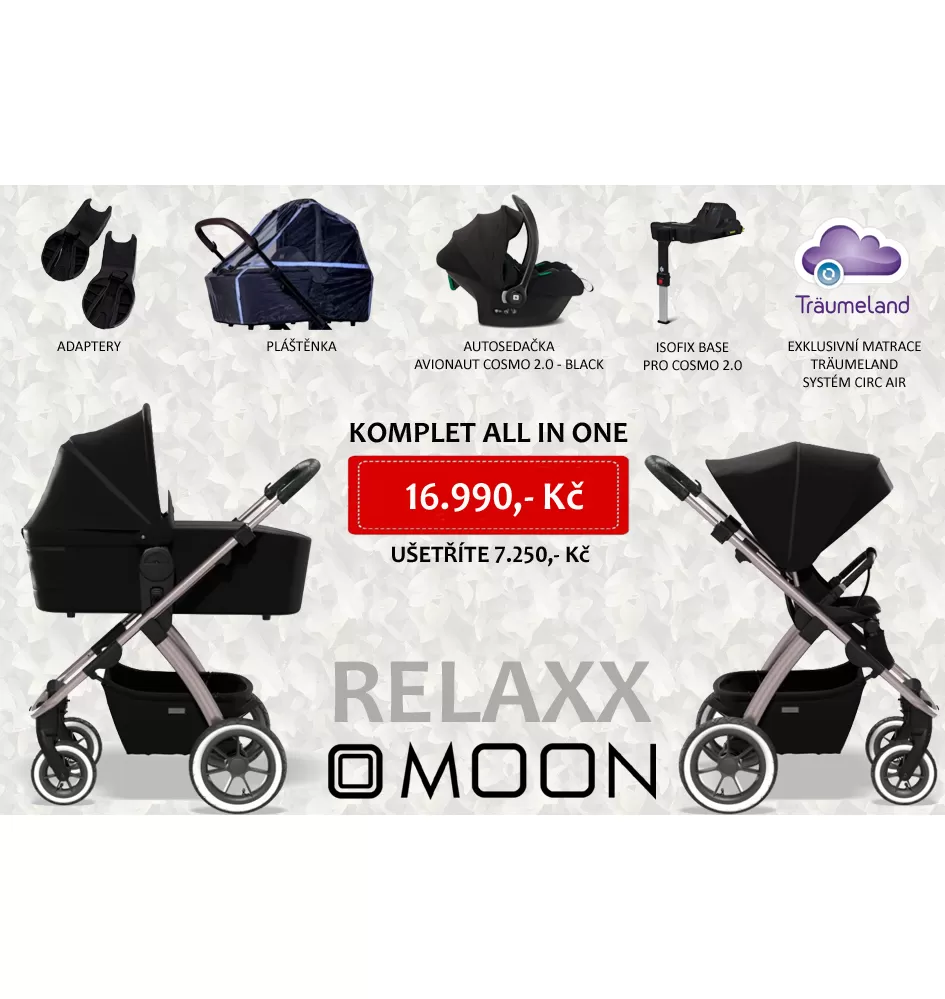 Výhodný set Relaxx Black obsahuje dvojkombinaci kočárku, autosedačku COSMO BLACK, Isofix, adaptér, pláštěnku, exkluzivní matraci Träumeland.