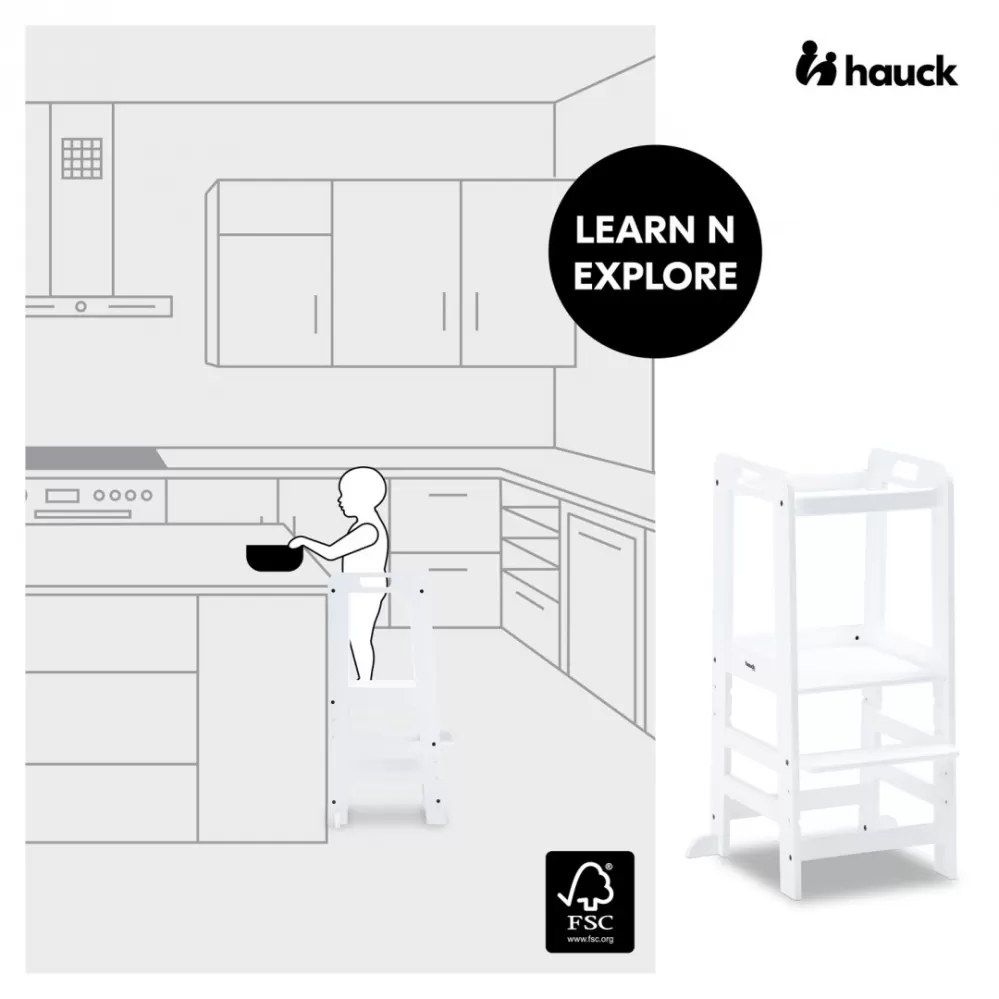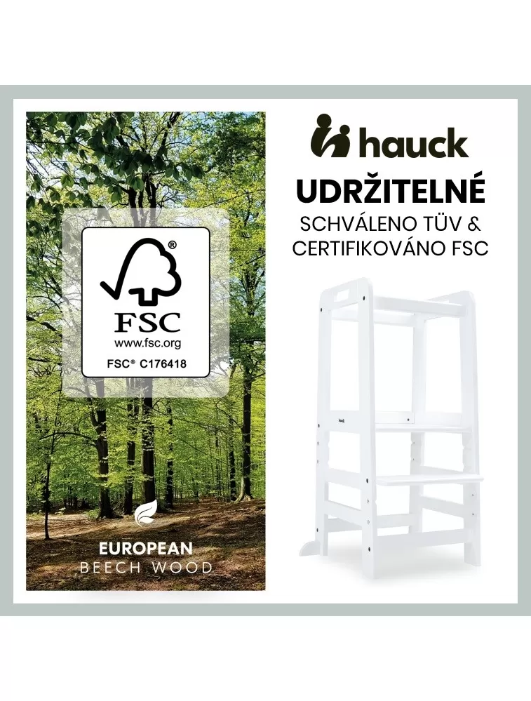 Díky vyvýšené poloze stupínku se může vaše dítě zapojit do běžných rodinných aktivit a pomáhat vám, bezpečně ve výšce očí. V duchu Montessori "Pomoz mi, abych to dokázal sám" se vaše dítě od útlého věku zapojuje formou hry, např. do vaření nebo pečení, a posiluje tak svou samostatnost, jazykový a sociální rozvoj i sebevědomí. Učící Věž pro batolata hauck má certifikát FSC®, což znamená, že bukové dřevo pochází z lesů s certifikátem FSC a šetrným lesním hospodářstvím.