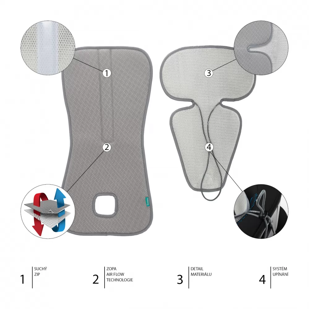 Prodyšnost zajišťuje unikátní technologie Zopa Air Flow, látka s 3D hexagon strukturou dovolující skrz vložku proudění vzduchu mezi autosedačkou a dítětem.
