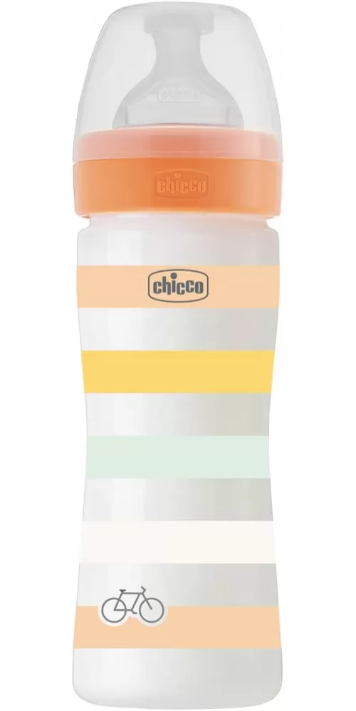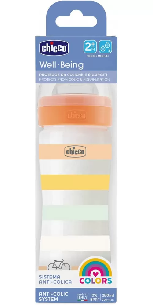 Kojenecké láhve Chicco Well-being nabízejí tu správnou láhev pro každodenní potřebu děťátka, aby pomohly mamince a děťátku vychutnat si klidný zážitek z krmení. Pomáhají snižovat koliku, reflux, a tím podrážděnost dítěte. Silikonová savička Physio s povrchovou úpravou Soft Sense je extra měkká a příjemná, díky čemuž se dítě cítí přirozeně. Dudlíky na láhev jsou vyměnitelné – ve 4 velikostech a umíte je přizpůsobit požadavku dítěte: - Pomalý průtok: ideální pro nejmenší miminka a děti od několika měsíců. Průměrný průtok: ideální pro děti během prvních měsíců života. Rychlý průtok: pro starší děti a dudlík na kaši: skvělý na hustší kašovitou stravu. - Ergonomická láhev se širokým a bezpečným hrdlem se vyznačuje vzduchotěsným uzávěrem, širokým hrdlem, které umožňuje její rychlé naplnění a snadno se čistí. - Antikolikový ventil: antikolikový ventil na spodní části dudlíku umožňuje lahvím zabránit posunutí dudlíku a sání vzduchu, čímž se předchází kolice. Láhev umožňuje hladké a klidné krmení. - Dudlík Physio Soft Sense: dudlík Physio se symetrickým, prodlouženým a zploštělým tvarem napodobuje mateřskou bradavku, čímž zajišťuje snadné sání a přijímání pokrmu; díky speciální povrchové úpravě Soft Sense je dudlík sametový a nadýchaný pro ještě přirozenější a pohodlnější sání. - Barvy a dekorace: kojenecké láhve jsou dostupné v rozličných barvách a dekorech pro trendy každodenní krmení.
