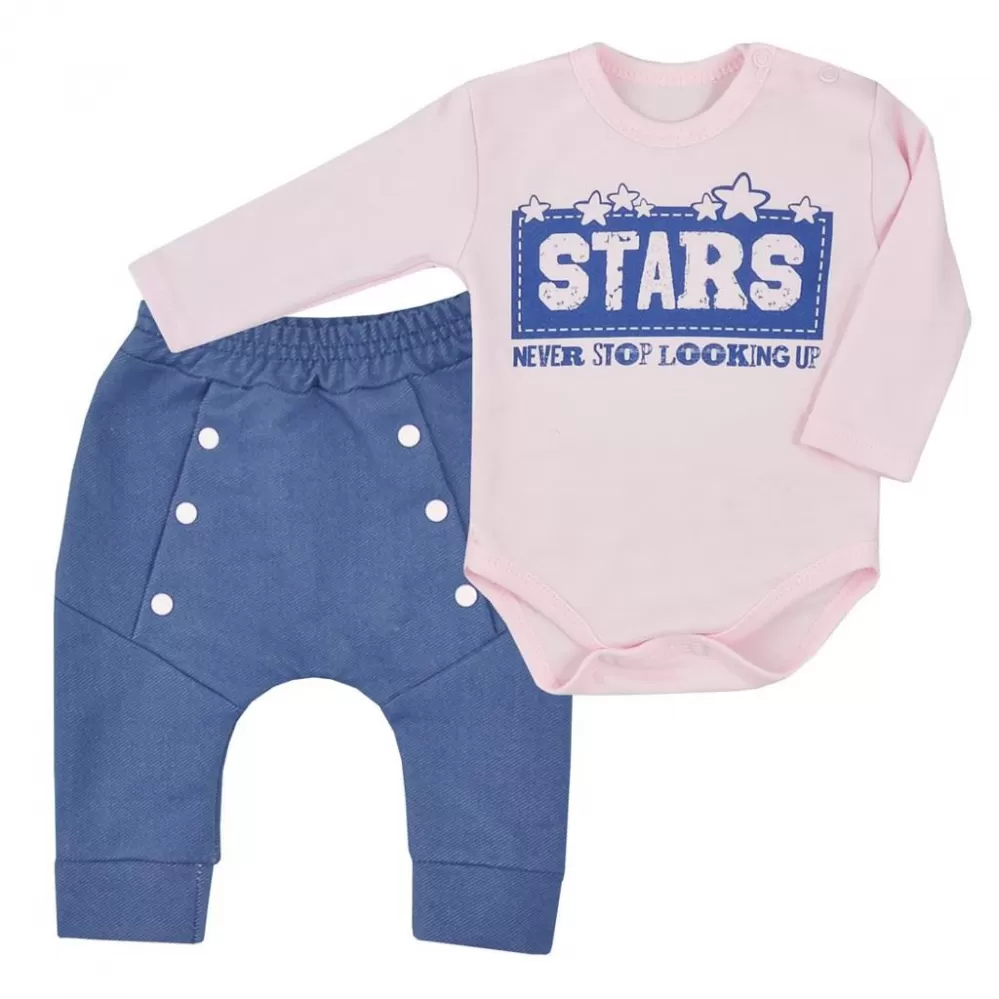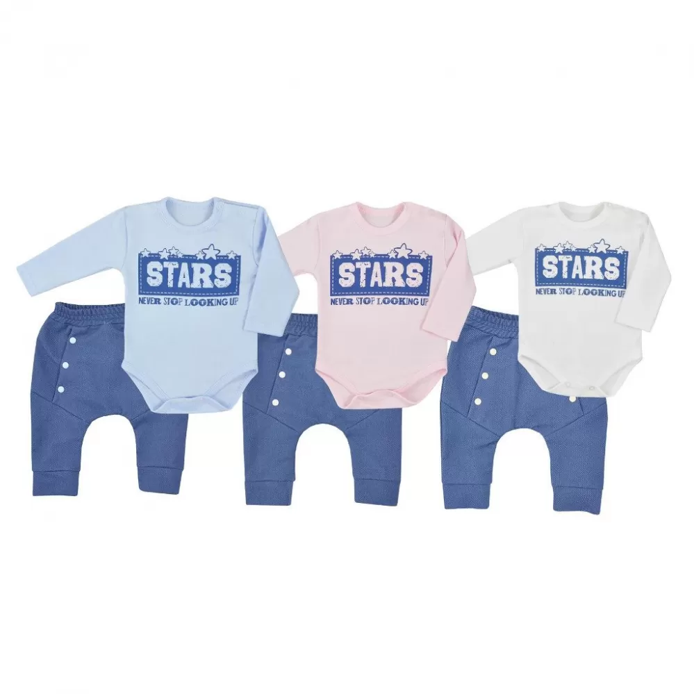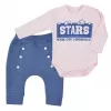 Dětská 2-dílná soupravička Koala Never Stop. Součástí soupravičky jsou tepláčky a body. Body má zapínání na cvočky na ramínku a mezi nožičkami. Zdobí ho nápis STAR. Tepláčky mají na nohavičkách široký lem, v pase jemnou gumičku, imitaci cvočků a stylový snížený sed. Soupravička je roztomilá, stylová a zároveň kvalitní a praktická. Materiál: body: 100% bavlna, tepláčky: 70% bavlna, 25% polyester, 5% elastan.