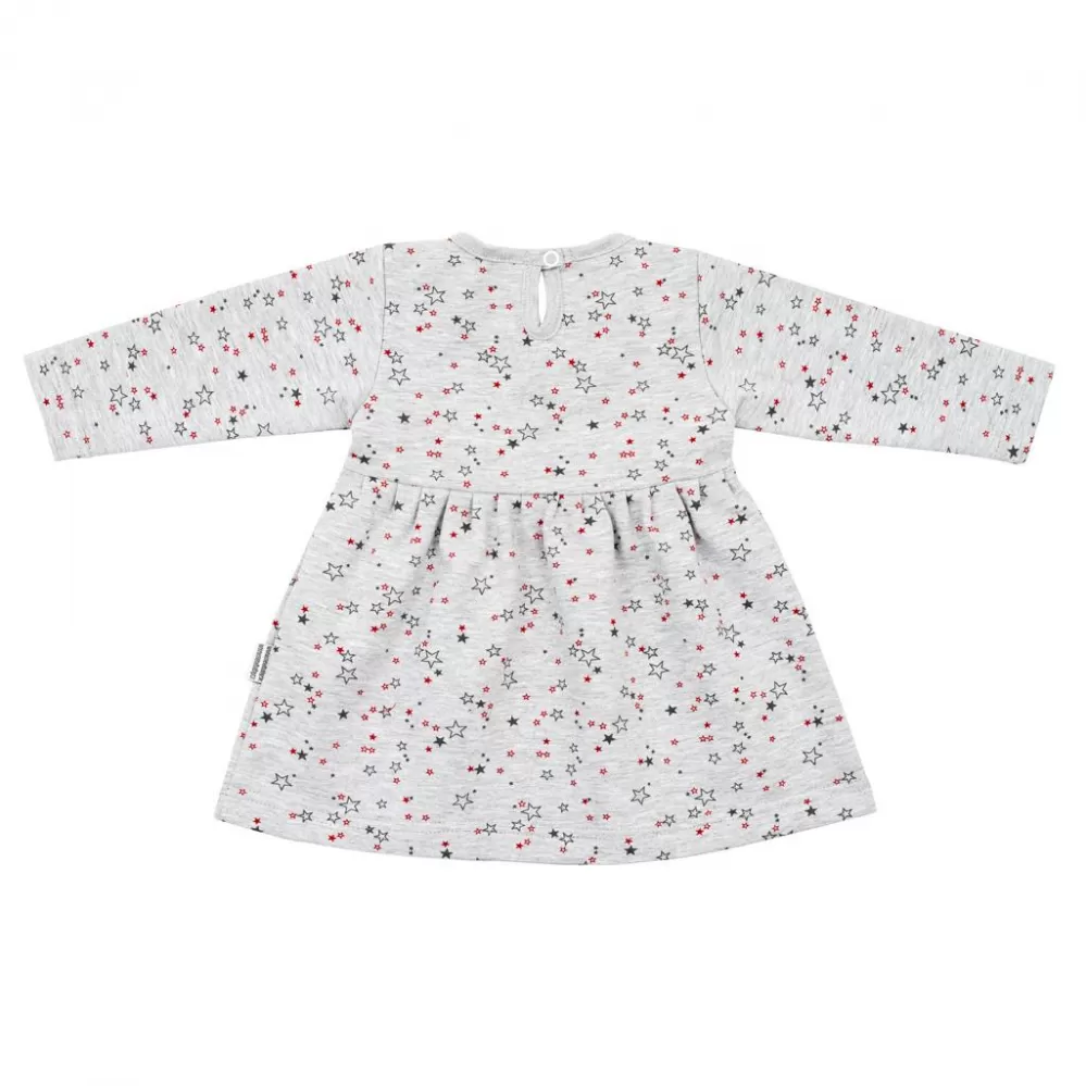 Kojenecké šatičky s dlouhým rukávem české značky New Baby For Girls. Šatičky Áčkového střihu celopotištěné hvězdičkami, jsou vhodné na jarní i podzimní období. V kombinaci s legínkami s naší nabídky budou šatičky vhodné na krásné procházky, nebo jako domácí oblečení. Šatičky jsou prostě neodmyslitelnou součástí holčičího šatníku. Zapínáni na cvoček na zadní straně. Složení: 92% bavlna, 5% polyester, 3% elastan.