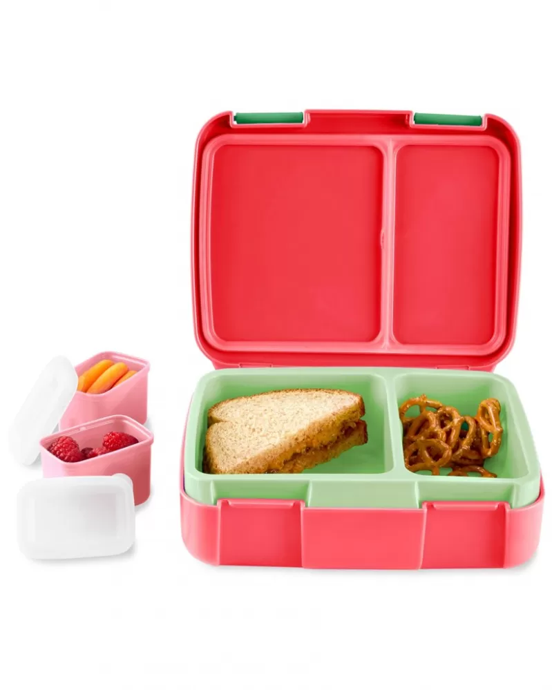 Vlastnosti: - Bezpečné těsnění pomáhá předcházet nepořádku. - Jednoduché otevírání a zavírání na západky. - Odnímatelný podnos vhodný do mikrovlnné trouby se 2 částmi. - 2 samostatné nádoby na svačinu vhodné do mikrovlnné trouby s víkem. - Pružná rukojeť pro přenášení. - Vhodné do myčky nádobí. - Polední krabička je vyrobena z kvalitního materiálu, který je vhodný pro děti. - Bez obsahu BPA. - Věk 3+. - Sladěno s kolekcí Skip Hop Spark Style®.