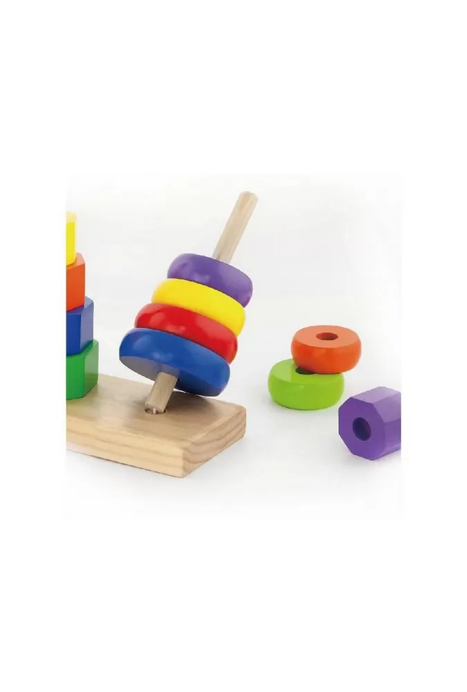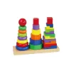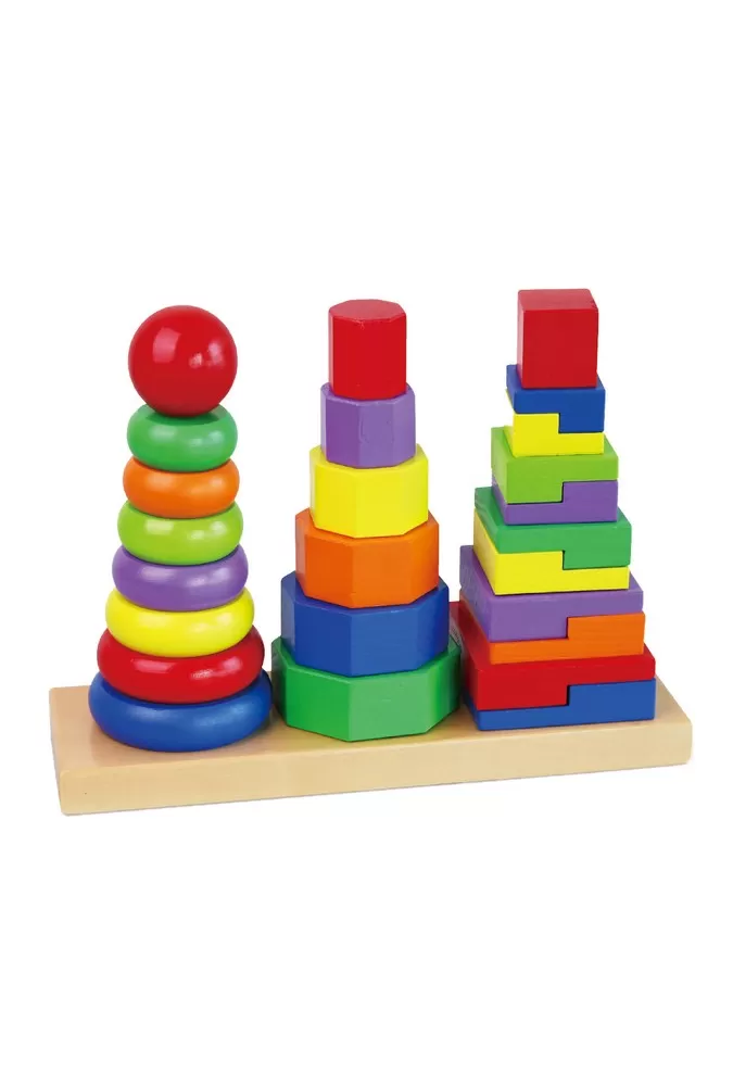 Barevné pyramidy Viga. Sada obsahuje 3 pyramidy, které jsou umístěny na dřevěném podstavci. Dítě musí umístit správný tvar na správné místo a ve správném pořadí, aby vytvořilo věž. Každá z nich má jiný geometrický podstavec. Hračka je vyrobena z lakovaného dřeva. Naší prioritou je bezpečnost a kvalita našich výrobků, a proto barvy použité na hračkách nejsou toxické a splňují bezpečnostní standardy (EN71 a ASTM). Pro děti od 12 měsíců.