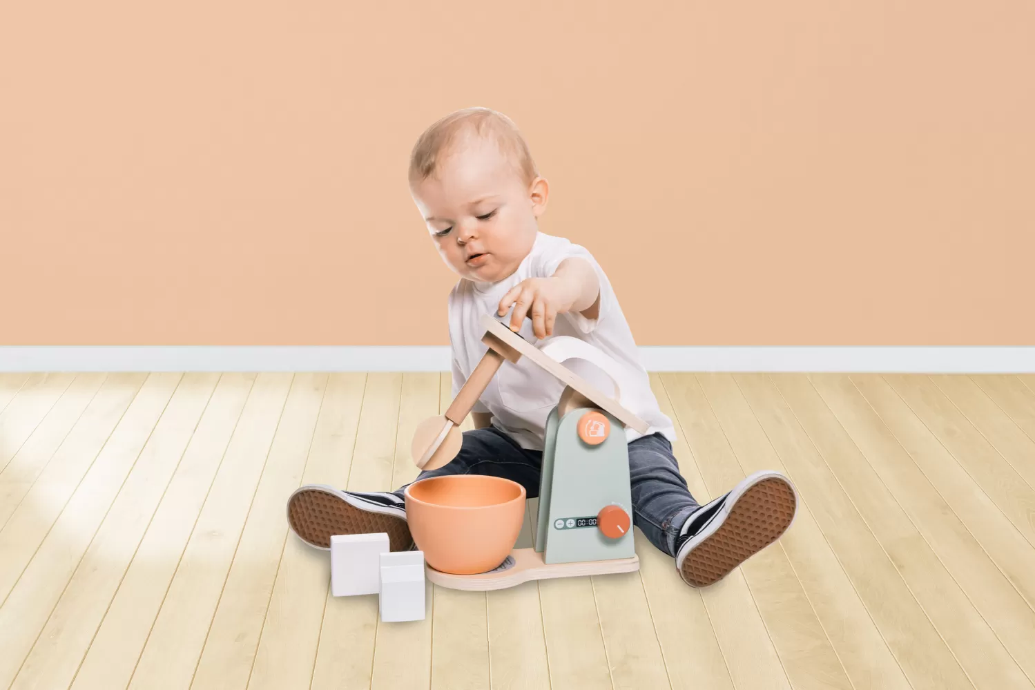 Propracovaný mixér pro všechny děti, které chtějí péct ty nejlepší moučníky. Mixér má několik tlačítek, které lze otáčet nebo stlačit. Součástí je mísa, ve které kuchyňský robot míchá těsto. Hračka je vyrobená z kvalitního dřeva a barev na vodní bázi.