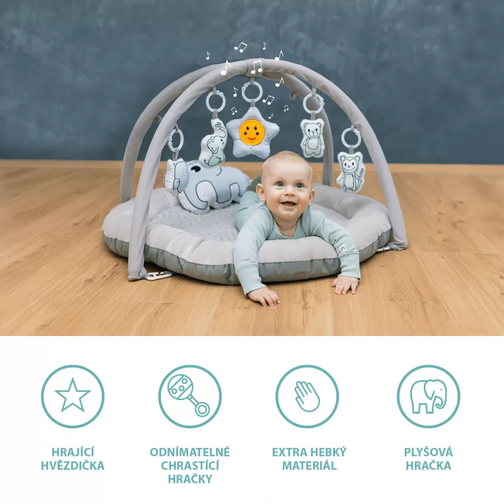 Heboučká hrací deka Comfort je ideální první hračkou pro vaše děťátko. Interaktivní plyšové hračky se štěrchátkem zábavnou formou motivují miminko k tréninku koordinace oko – ruka a později k úchopu. Hračky se dají jednoduše odepnout z hrazdičky a lze je použít na autosedačce nebo kočárku.
