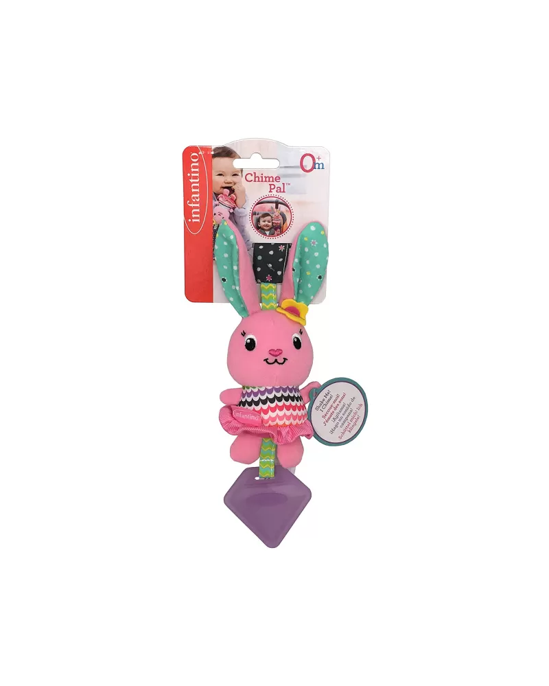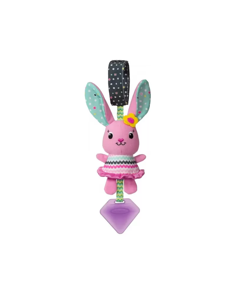 Růžový králíček nabízí různorodé textury ke zkoumání a kousátko, které pomáhá dítěti při prořezávání prvních zoubků. Při pohybu jemně cinká.