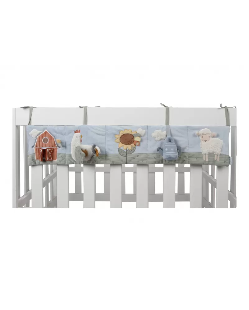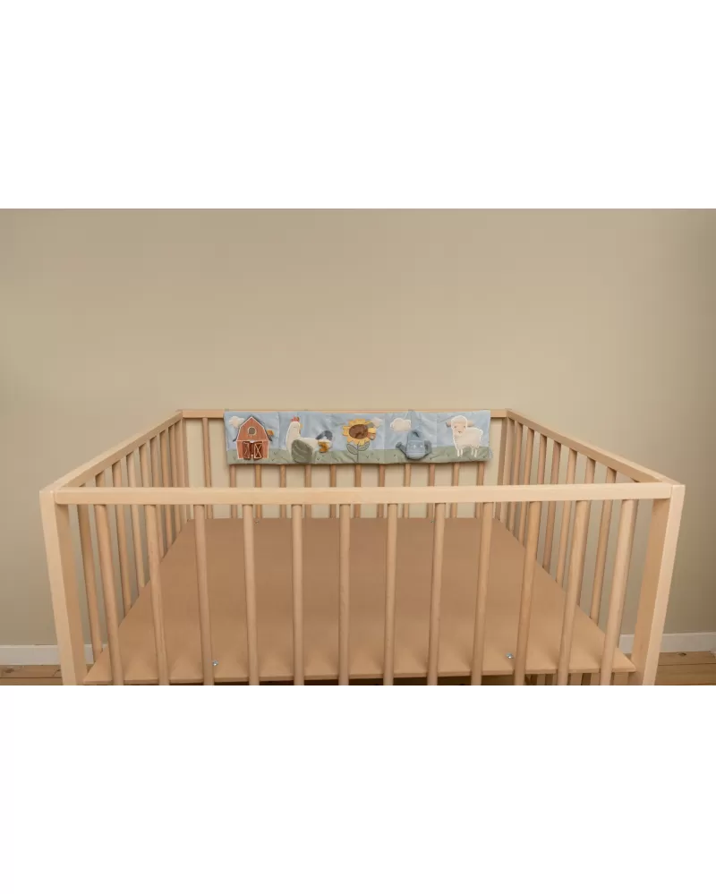 Měkký textilní mantinel s krásnými motivy ze života na farmě upoutá pozornost vašeho dítěte množstvím aktivit ke zkoumání a prohlížení. Nabízí různorodé textury, chrastítko, kousátko i bezpečné zrcátko. Při umístění před dítě ležící na bříšku podněcuje dítě ke zvedání hlavičky. Aktivity na mantinelu pomáhají rozvíjet jednotlivé smysly dítěte i koordinaci ruka / oko.