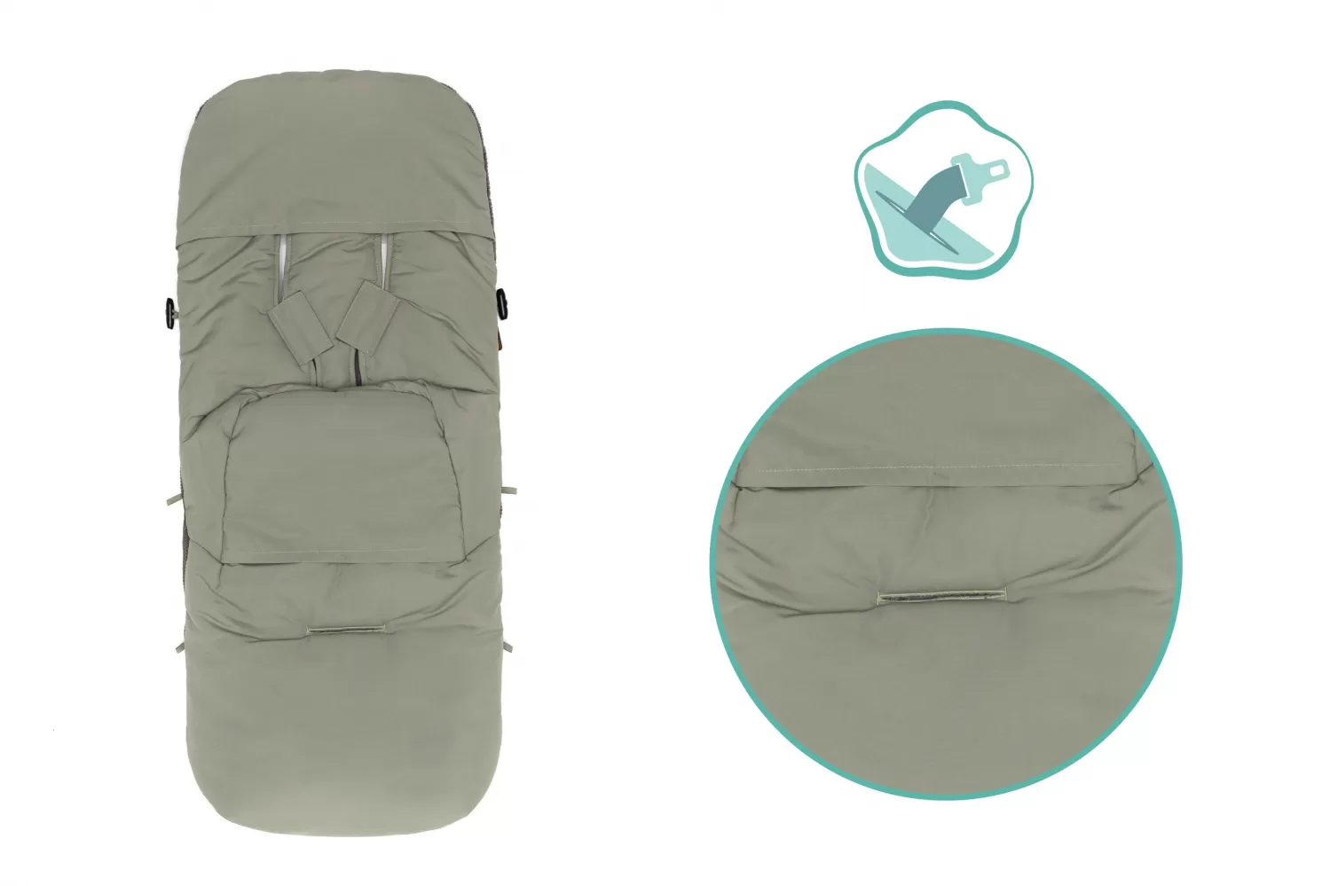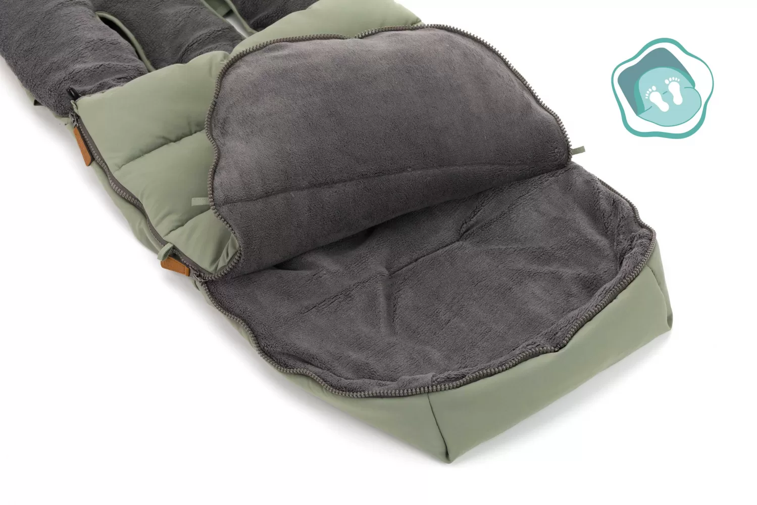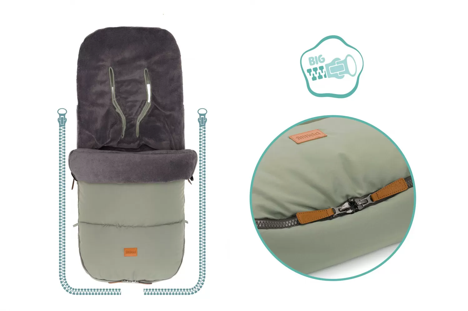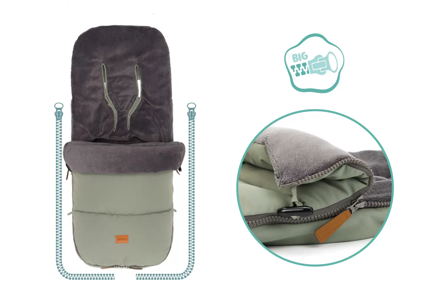 Díky celoobvodovému zipu je možné fusak částečně nebo zcela rozepnout. To umožňuje snadnější vkládání i vyjmutí dítěte z fusaku. Dva knoflíky po stranách umožňují sklopení přední části a vaše dítě je tak chráněno proti průvanu.