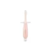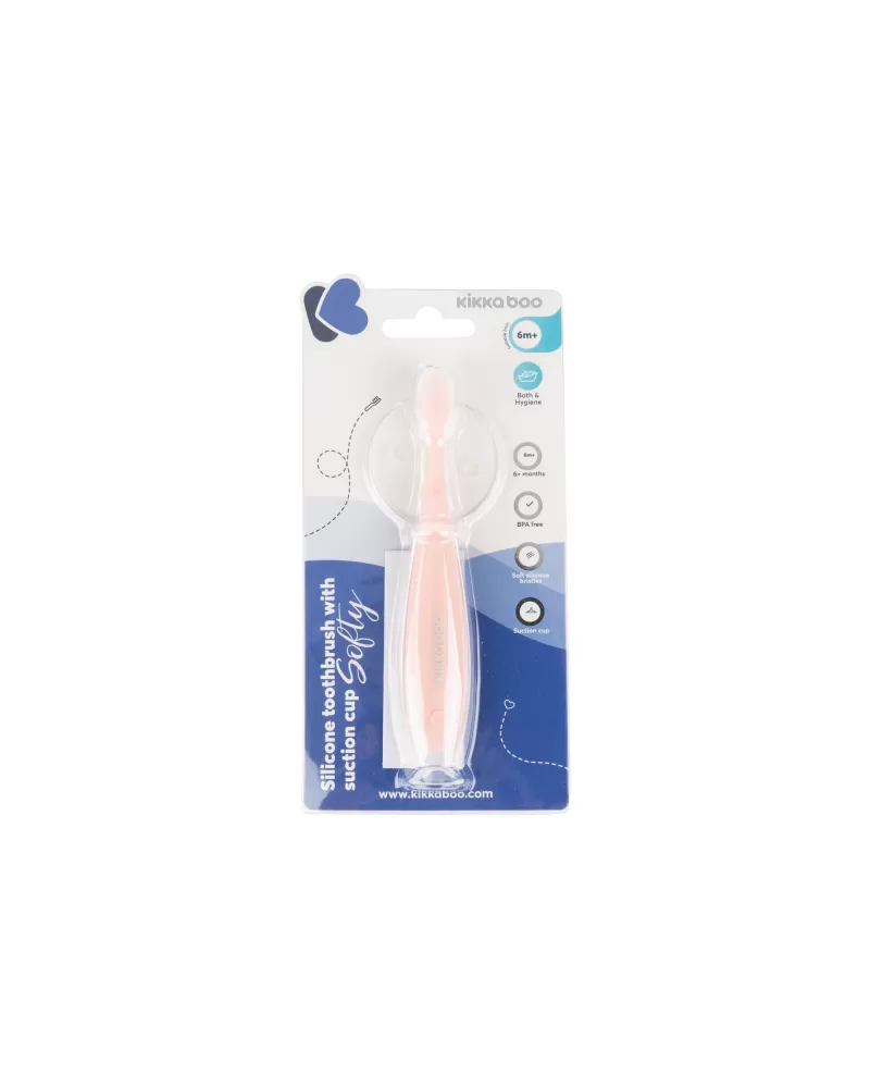 Kartáček na zuby pro nejmenší z jemného, měkkého silikonu má protiskluzovou rukojeť a kruhovou zábranu pro bezpečné čištění prvních zoubků dítěte. Přísavka umožňuje uchycení kartáčku na umyvadlo, když jej nepoužíváte.
